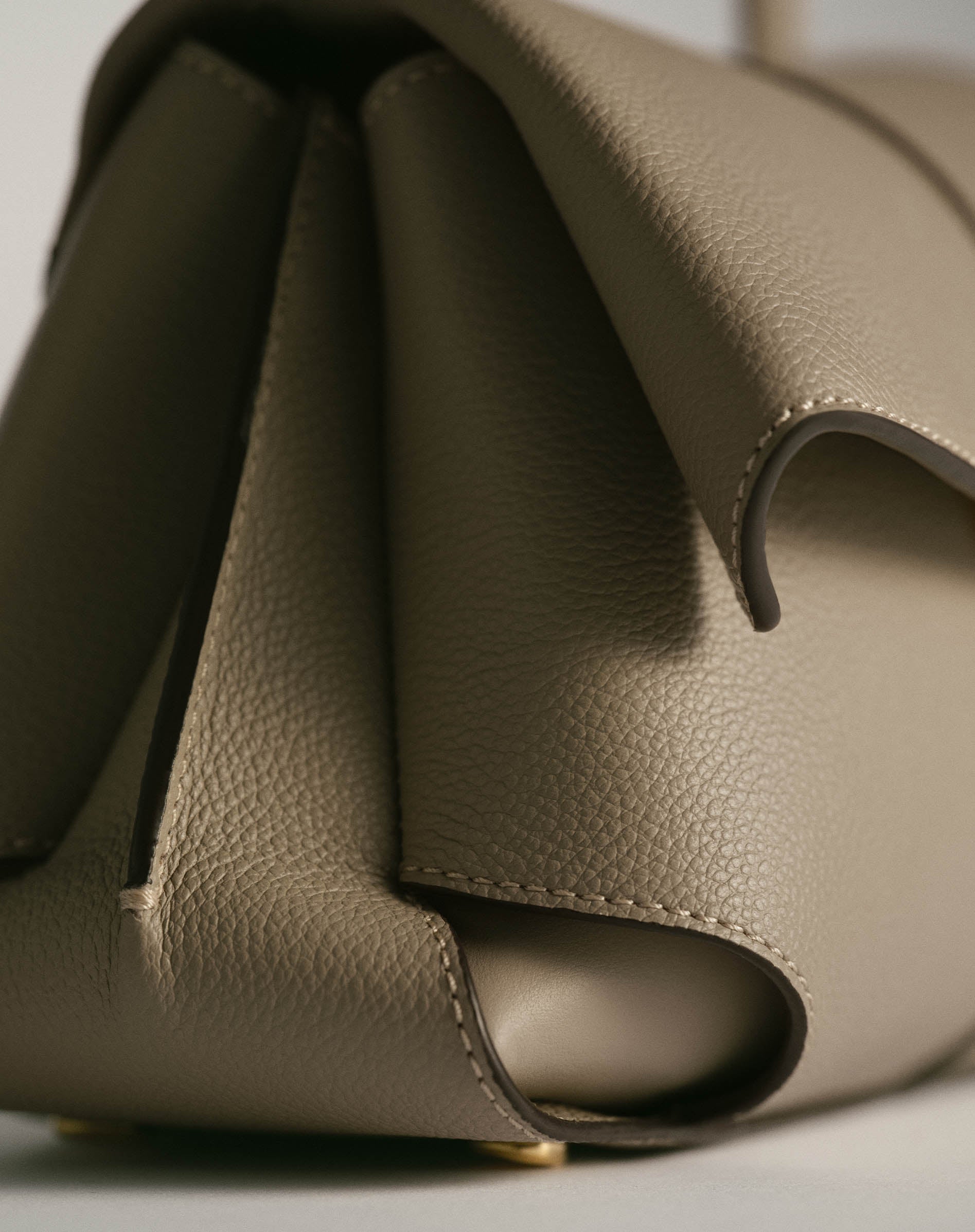 Sa signature stylistique se retrouve dans le travail de la courbe et du pli qui nécessite une parfaite connaissance du cuir pour maîtriser sa malléabilité et le naturel de son tombé. A la clé, lignes organiques, formes pures et dynamiques ponctuées de fermoirs et boucles travaillés comme des bijoux. Un équilibre subtil entre sobriété et singularité.