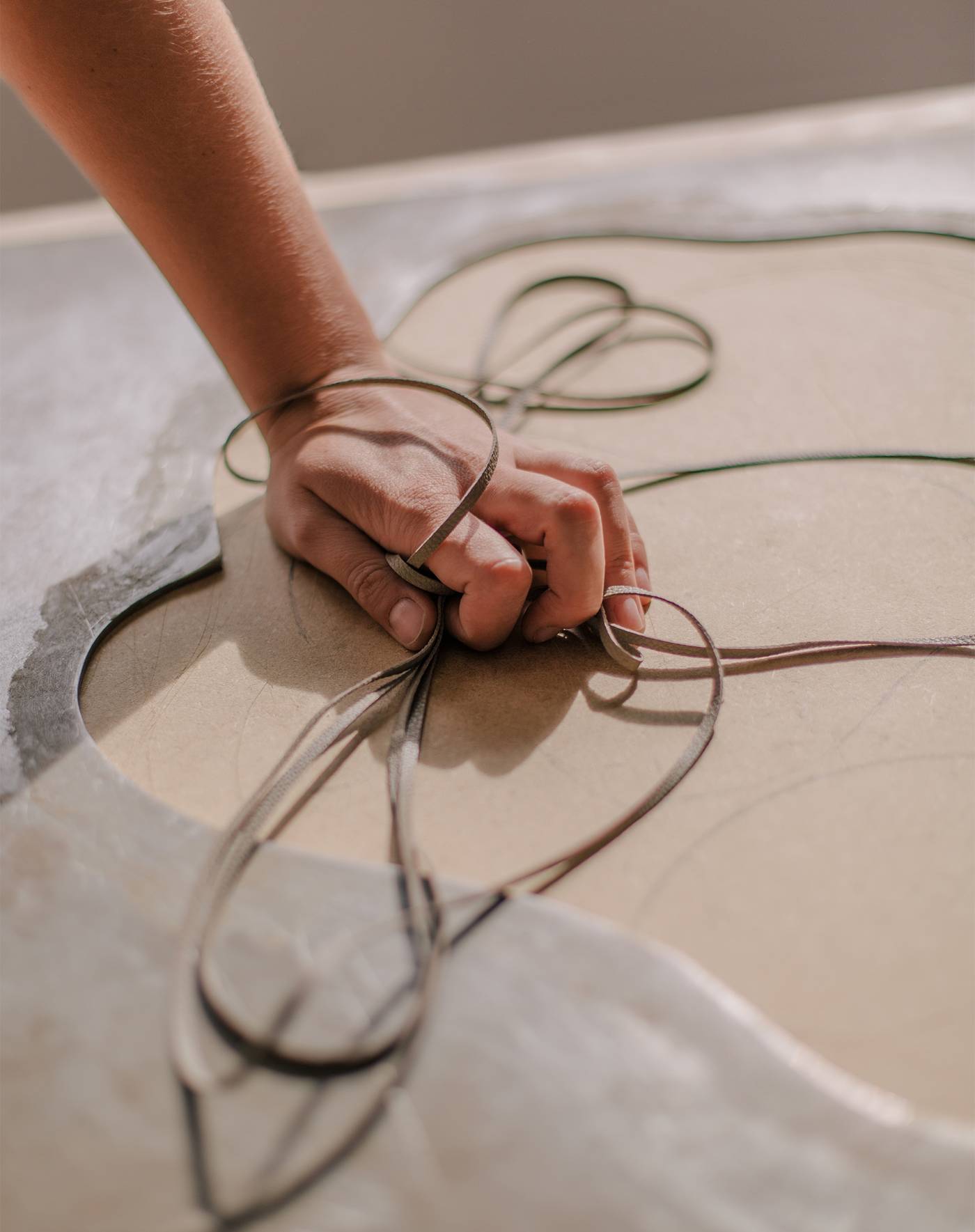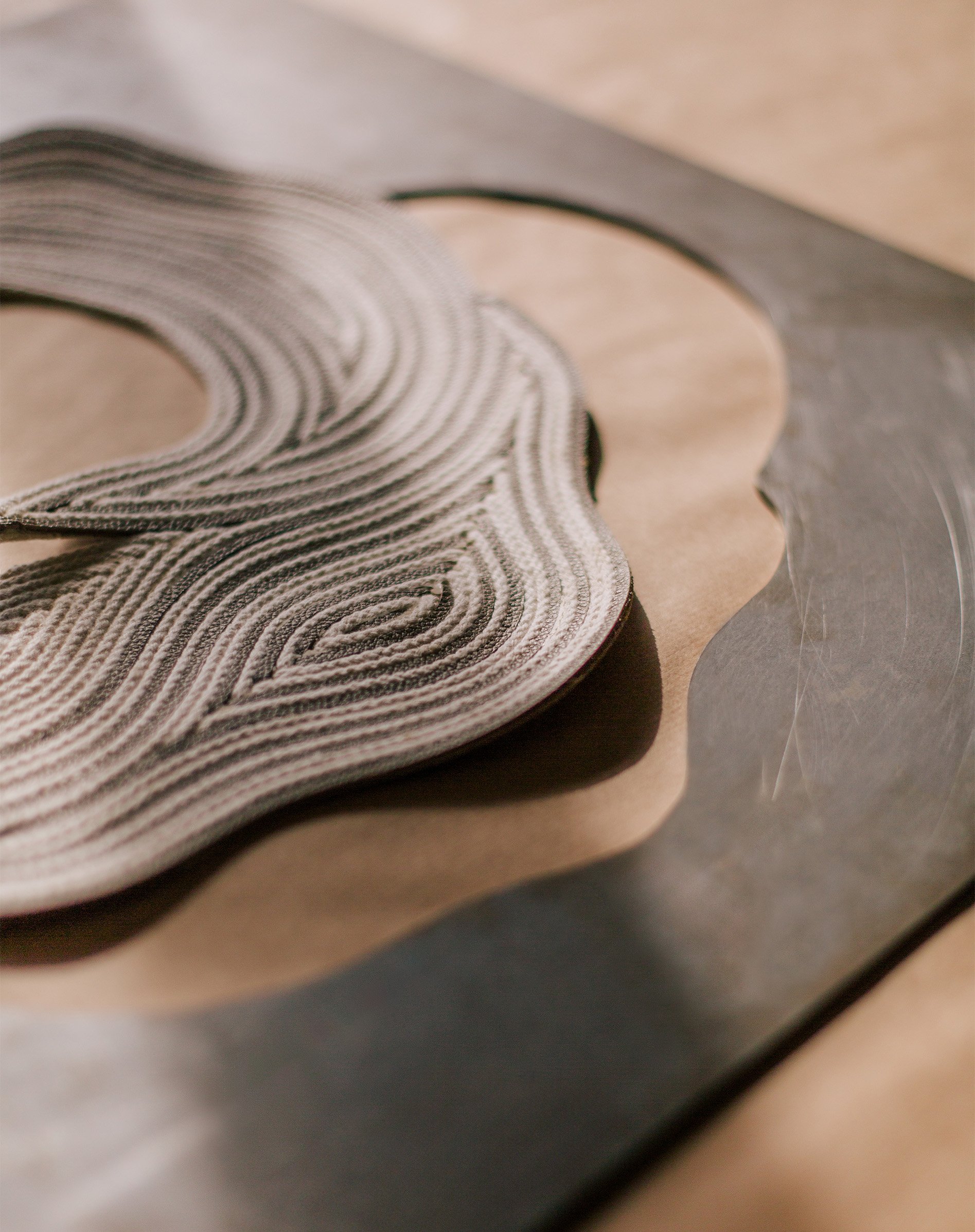 Ingénieuse exploratrice des matières, Wendy Andreu a mis au point une méthode il y a près de dix ans utilisant des enduits de silicone plutôt que la couture ou le tissage pour associer des matières. Pour la première fois dans son œuvre, elle s’approprie le cuir. La designer dispose sur un support en bois ses cordes de coton et les bandes de cuir en spirales. Elle couvre l’ensemble de silicone, puis après un temps de séchage, peut démouler chaque miroir.