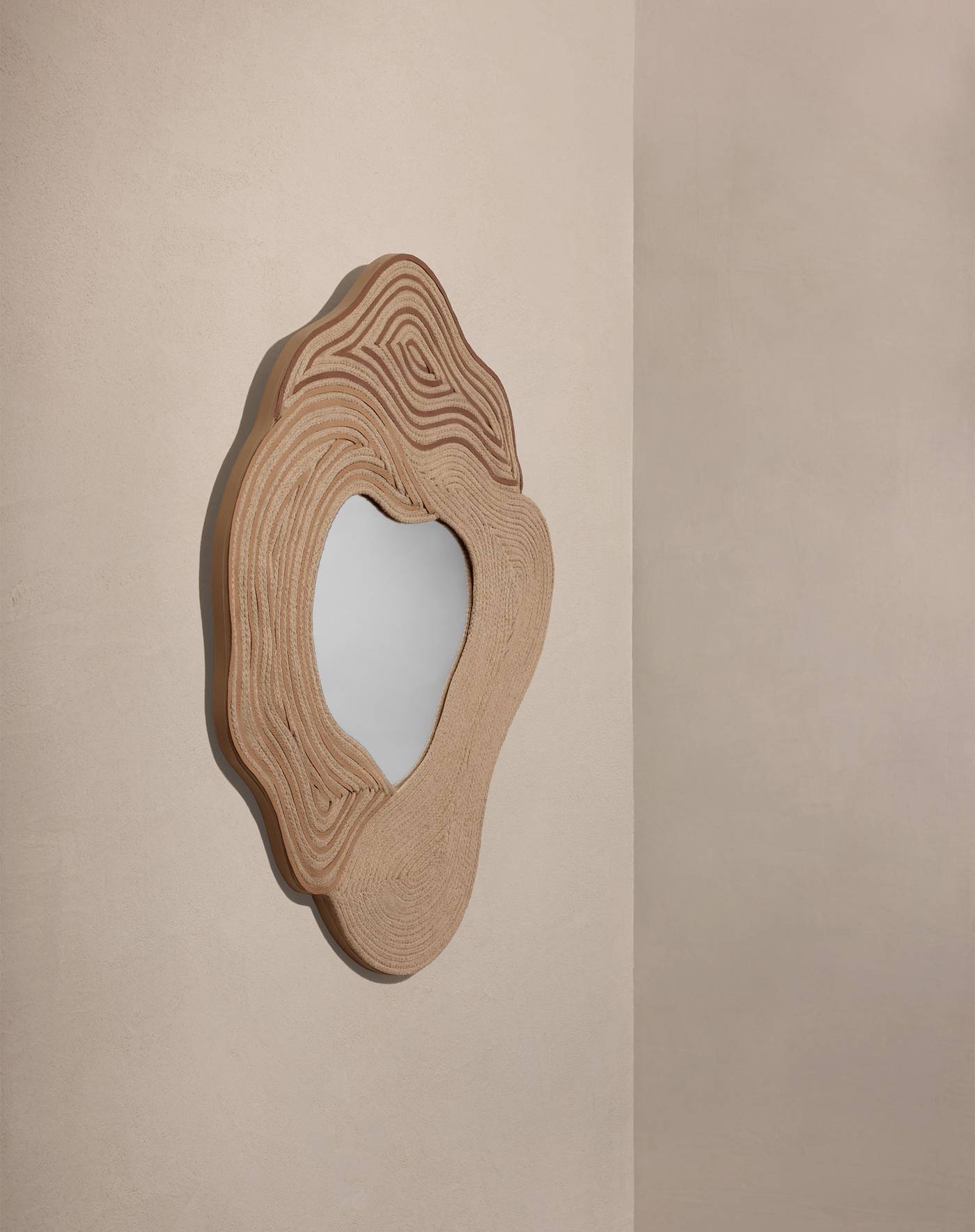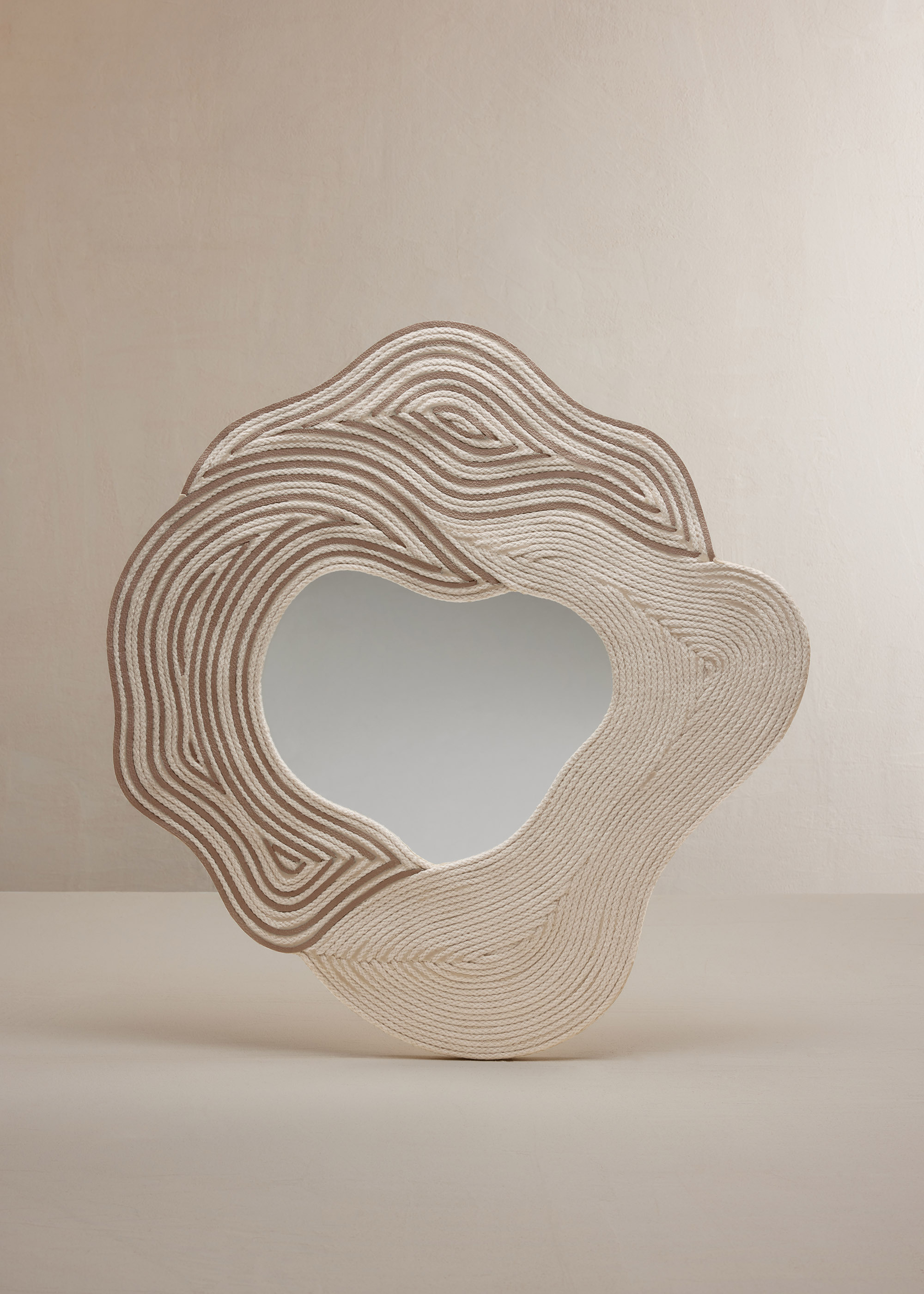 Wendy Andreu a imaginé le design du miroir en jouant avec la fluidité des lignes et les teintes naturelles, thèmes chers à Polène. A la clé, un paysage de montagnes qui se poursuit à 360° degrés. Pour le premier modèle, elle a choisi d’associer des cordes en coton écru à du cuir taupe grainé. Pour le second, elle a privilégié des cordes en coton naturel et des chutes de cuir beige et camel grainé. Le silicone utilisé se fond en ton sur ton selon les teintes des modèles. Grâce aux deux attaches métalliques, le miroir se positionne selon l’orientation souhaitée.