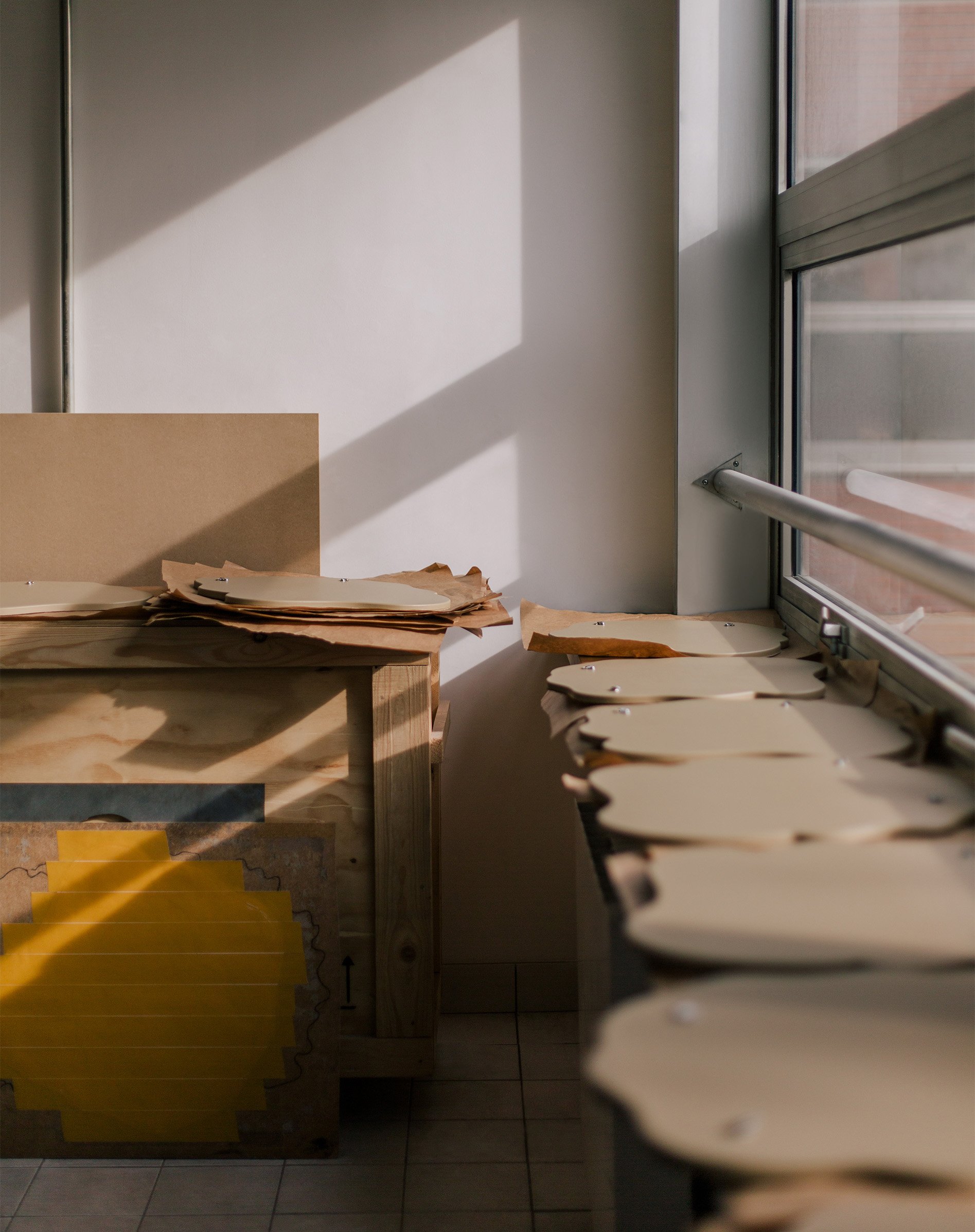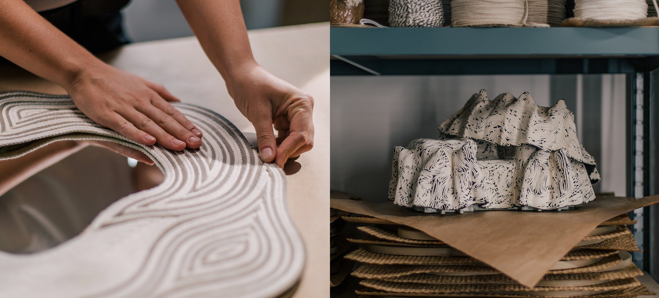 Mêlant coton et chutes de cuir, une série de miroirs en édition limitée reflète l’habileté de l’artisanat, la quête d’innovation et la créativité du savoir-faire partagées par la designer Wendy Andreu et Polène.