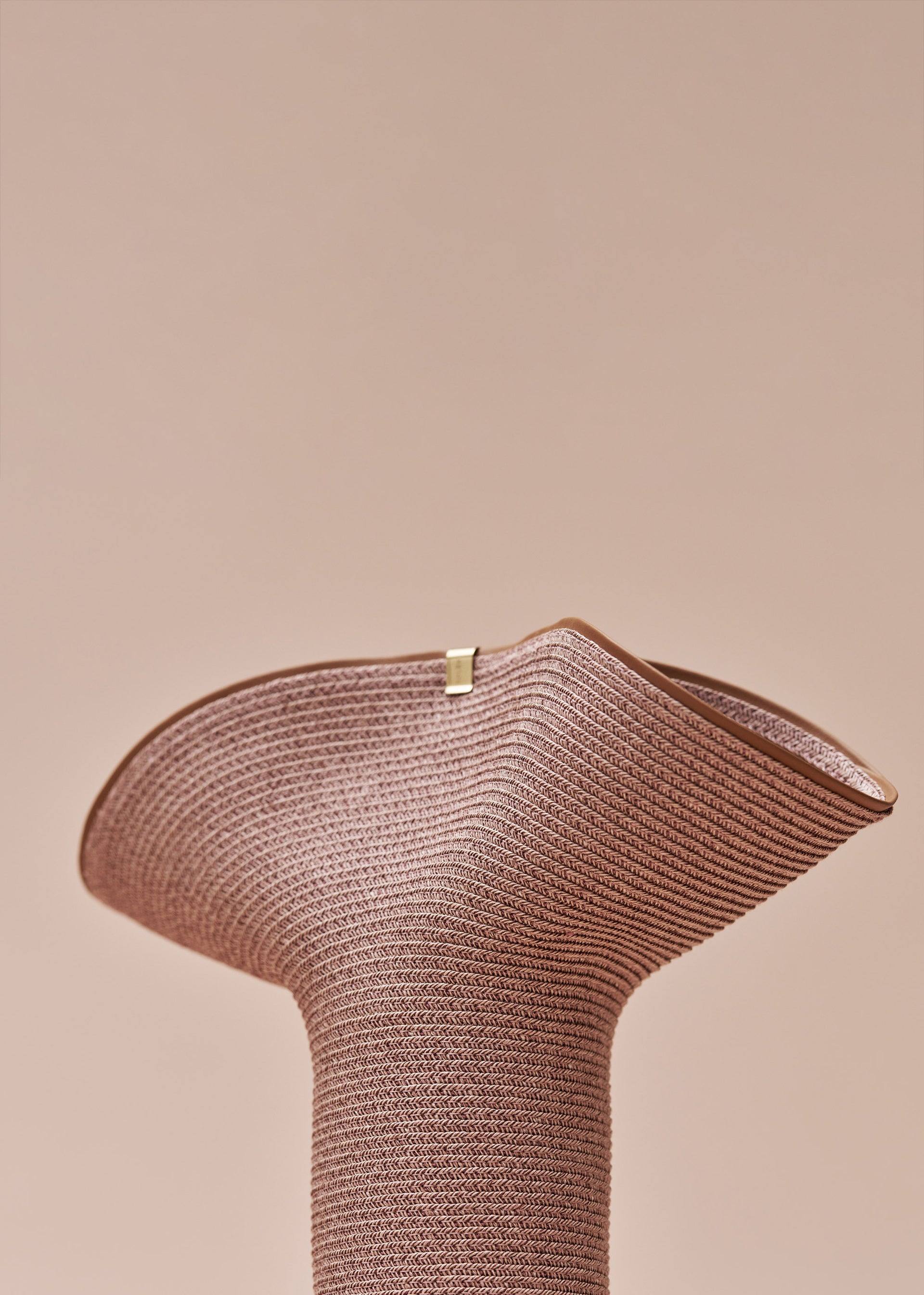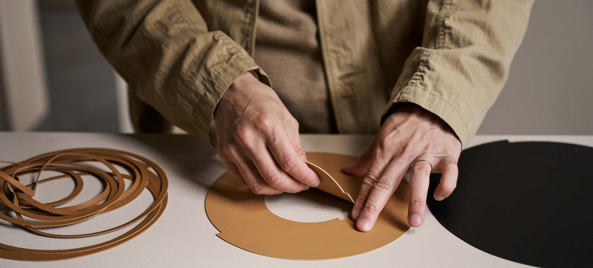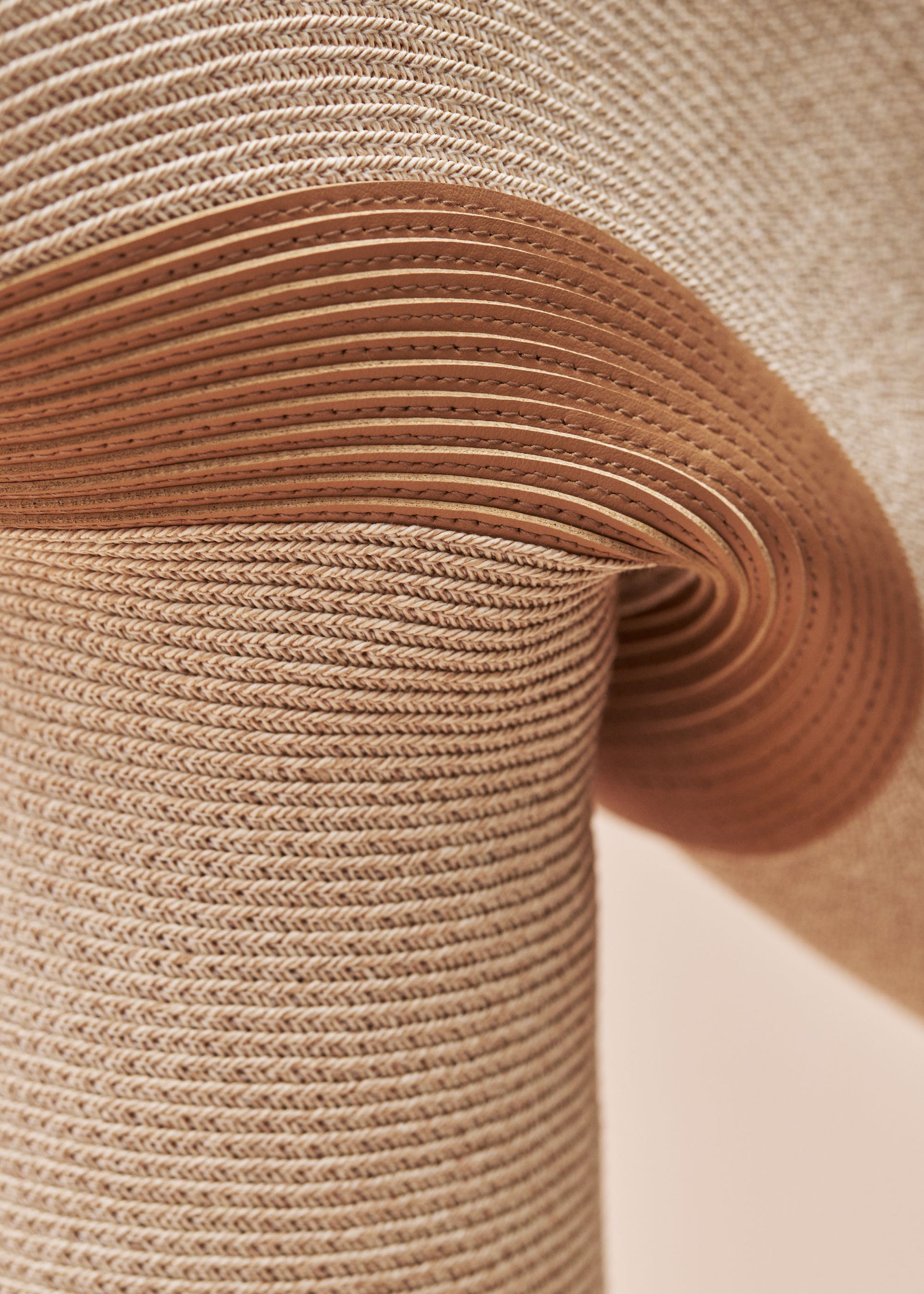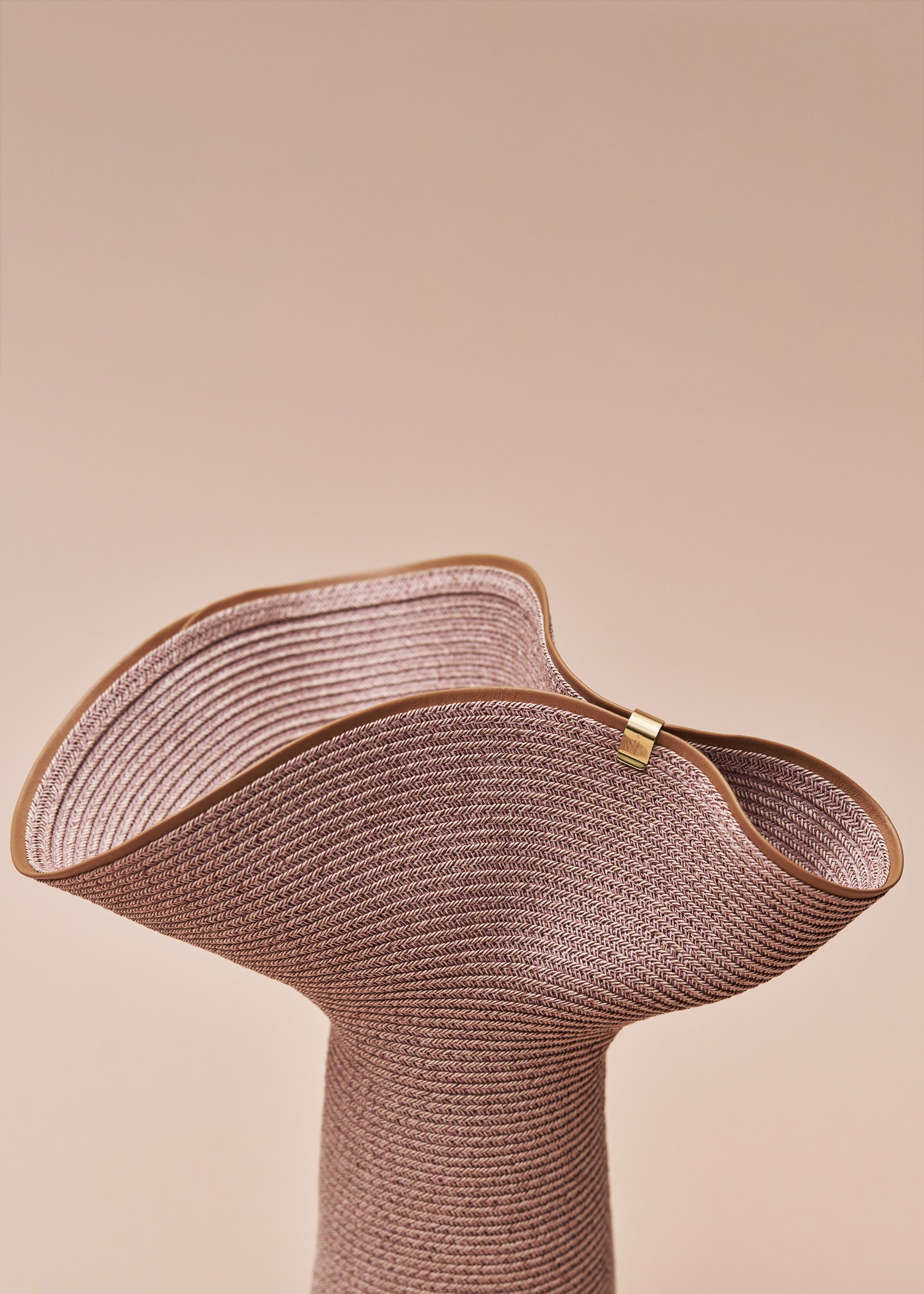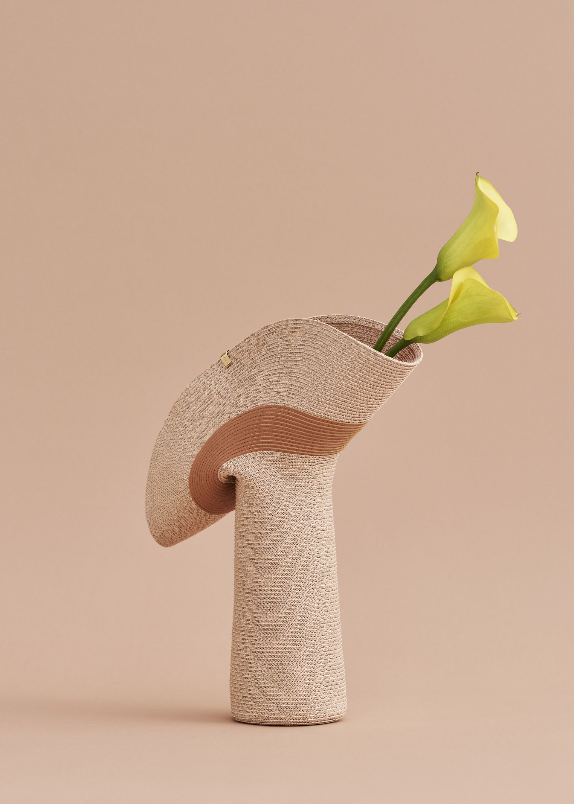 La quête partagée d'une esthétique minimaliste et l'amour commun de l'artisanat ont permis un dialogue créatif riche entre designers et artisans des deux maisons. Le vase "Lapel" et sa forme organique, tout en plis et ondulations, est ainsi réinterprété pour mêler à la fibre de papier tissées les chutes de cuir Polène. Un long travail de prototypage a permis la naissance de cette collection en édition limitée.