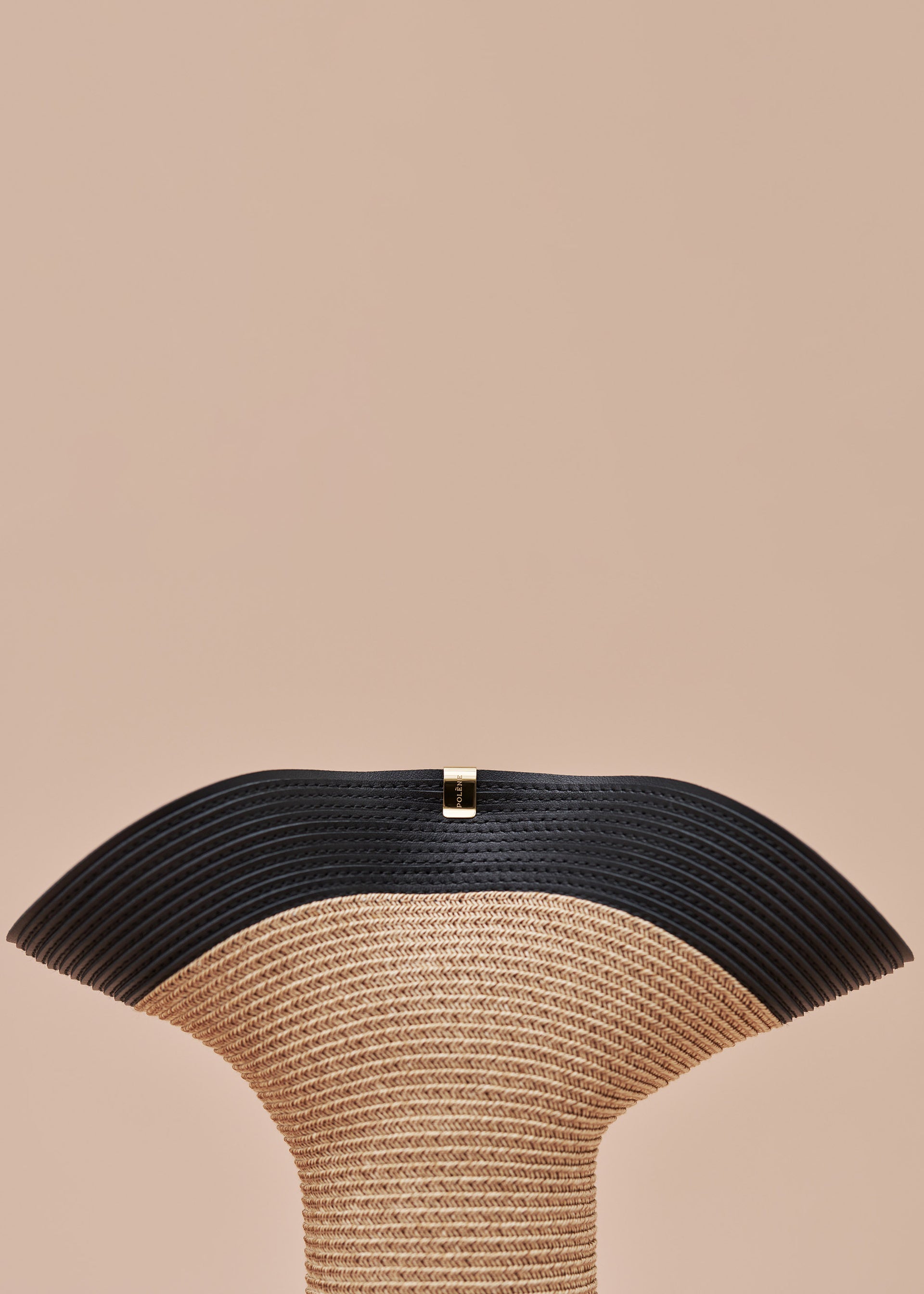 Le "Lapel Grand" associe à la fibre de papier sable les chutes de cuir tan. L’encolure du vase est ornementée de lignes de cuir qui soulignent le passage d’une forme tubulaire à un col organique, tout en ondulations.