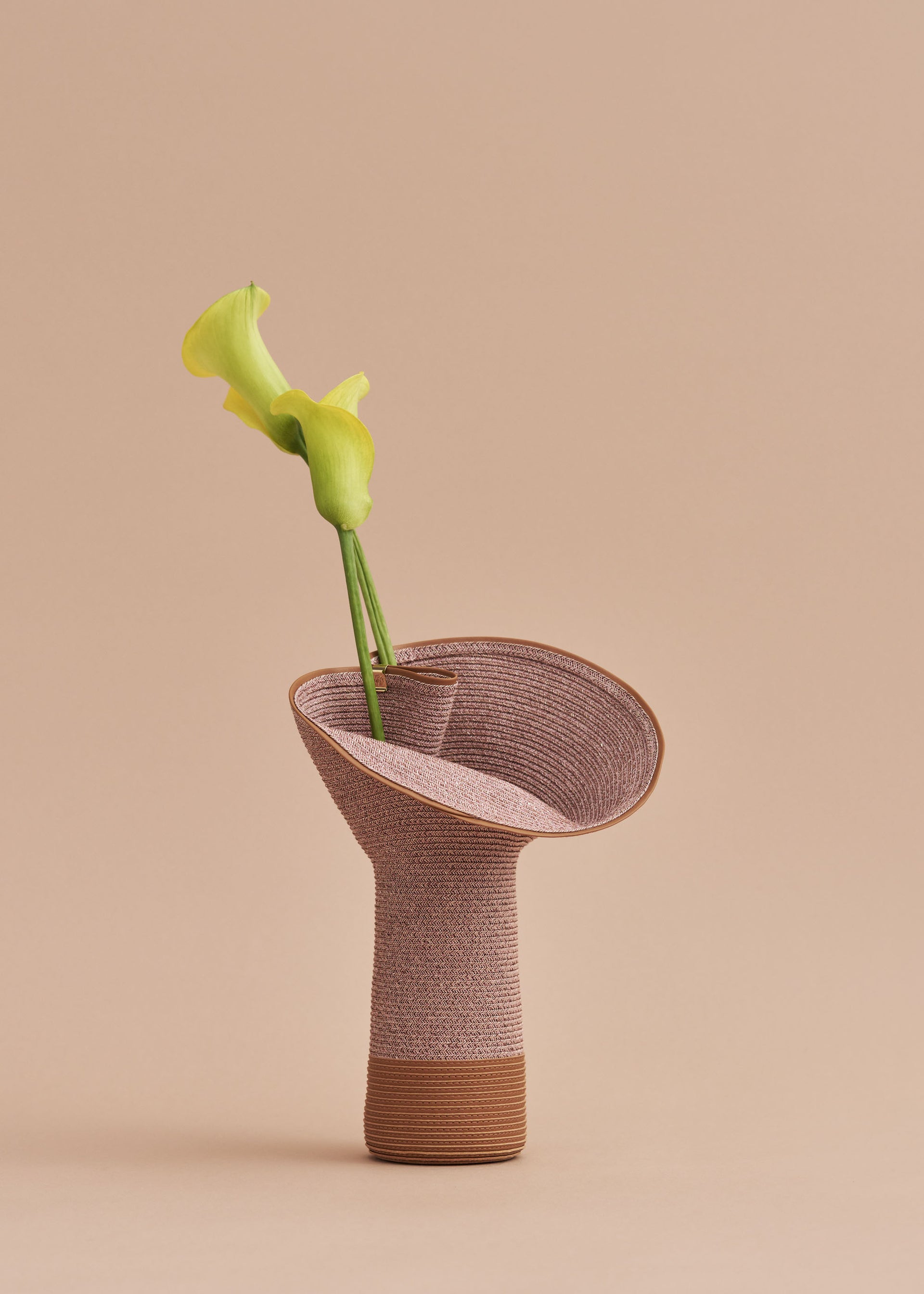 Les chutes de cuir, par définition de taille et de forme variables, sont découpées sous forme de spirales pour être ensuite cousues avec soin aux bandes tissées de Mobje. A la clé, trois vases aux duos de couleurs singuliers avec, pour chacun, un placement du cuir qui lui est propre.