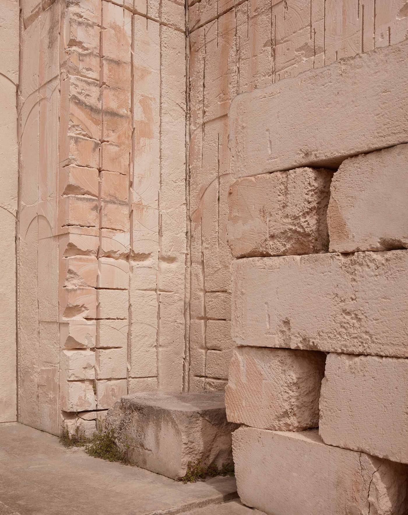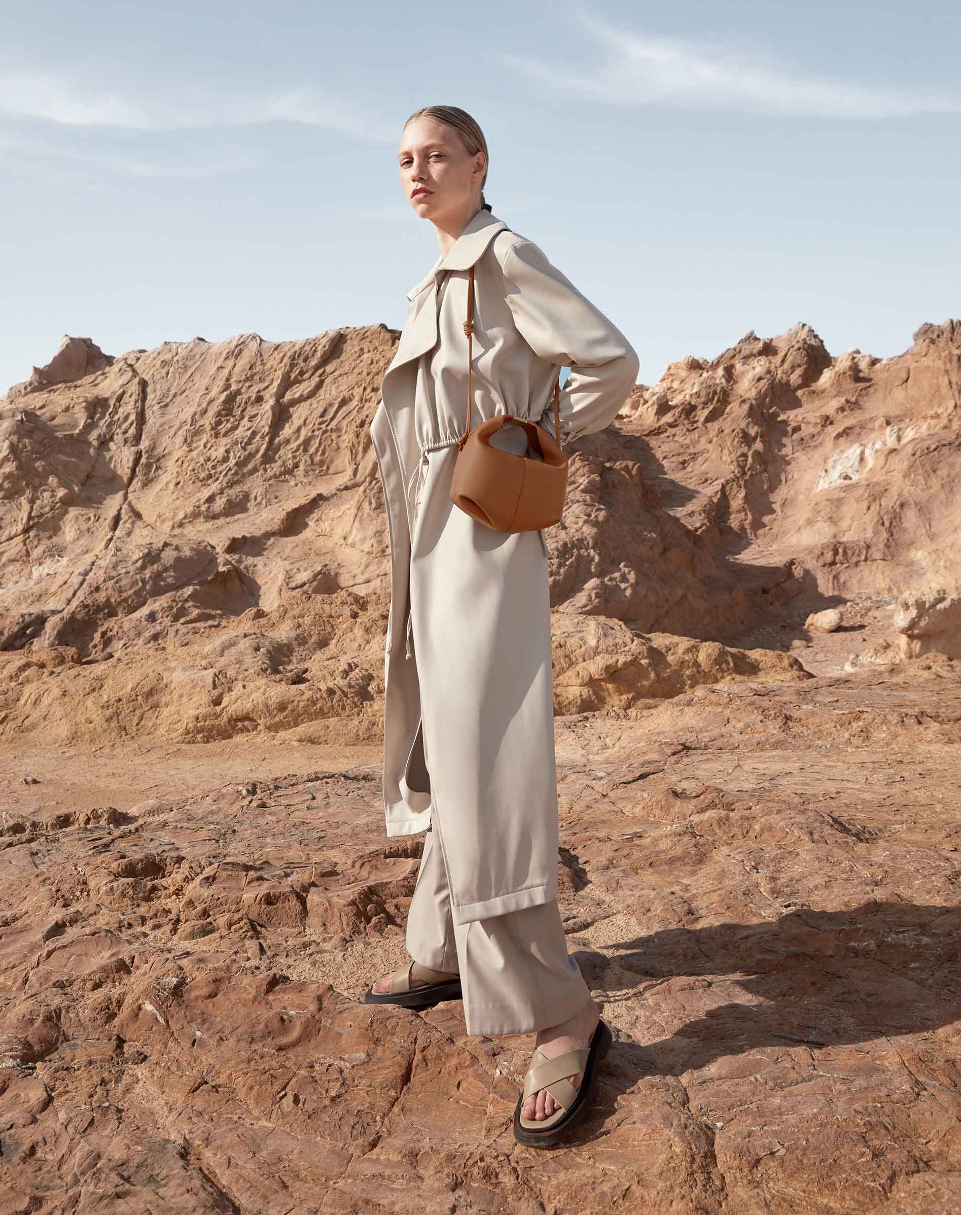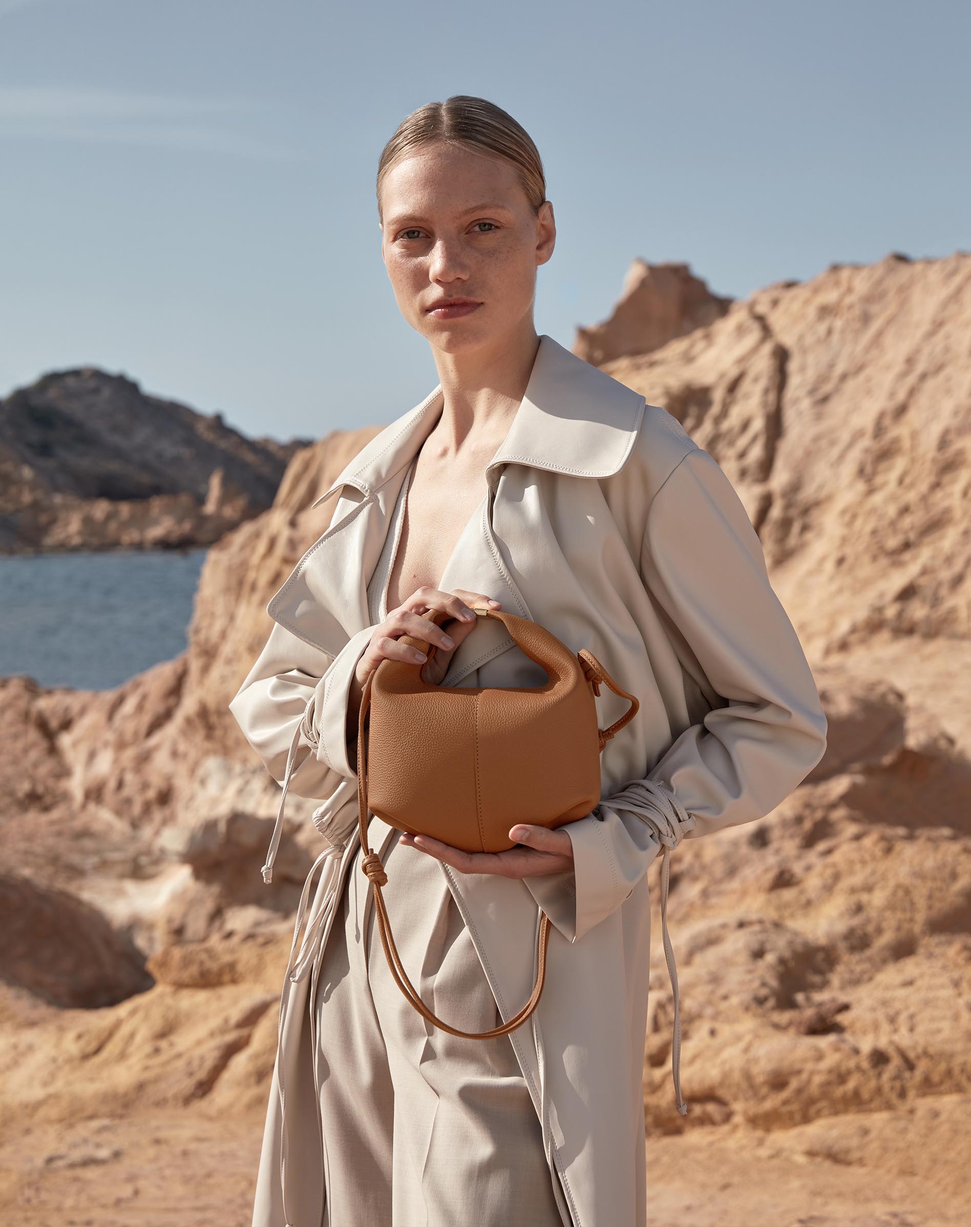 Roches ciselées venant plonger dans la mer, labyrinthe minéral, carrière de pierre architecturale viennent accueuillir la collection de maroquinerie Polène.