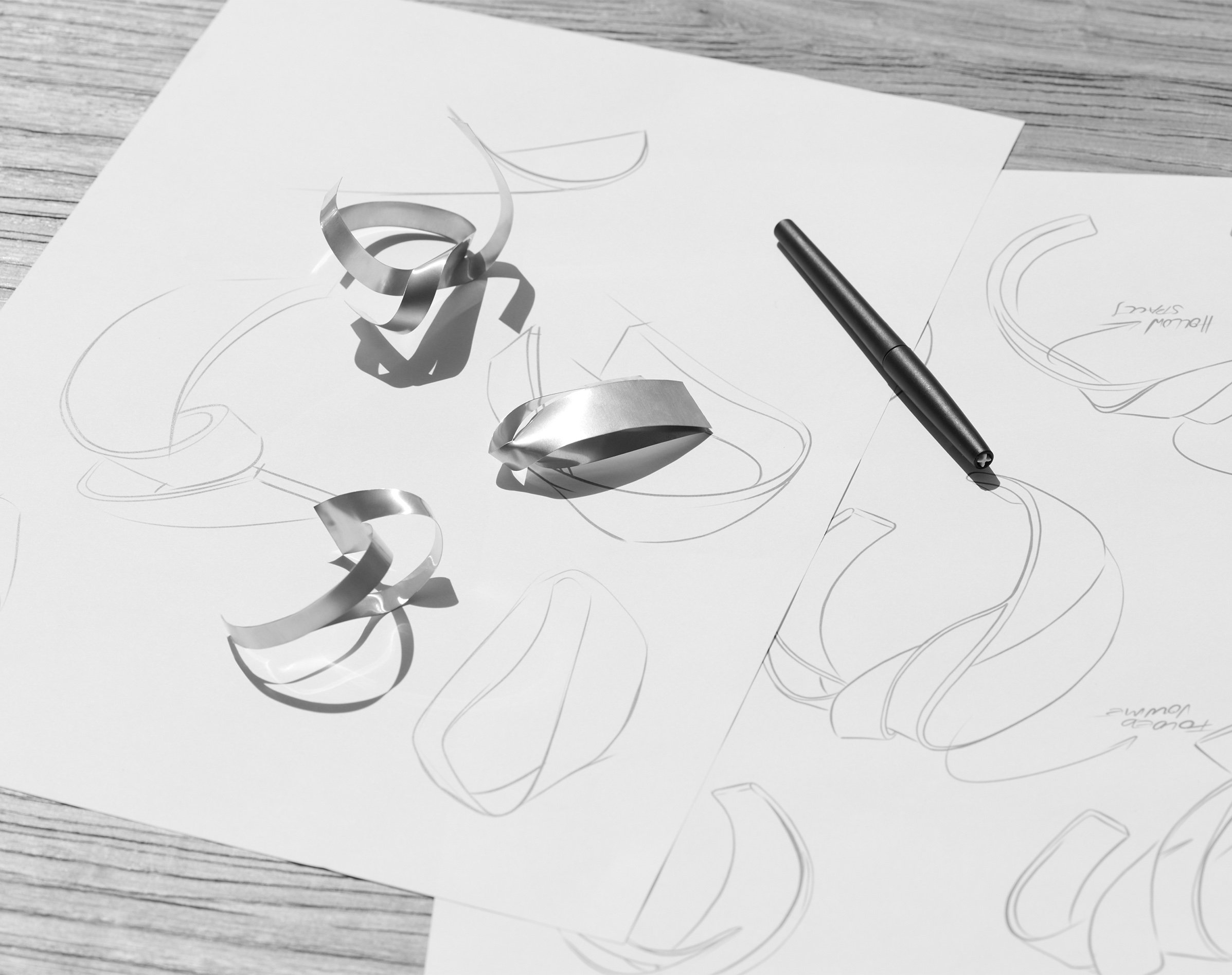 Inspirée par les ondulations aléatoires du vent, la collection fait la part belle au travail de la courbe, proposant des formes fluides, des rubans de métal tourbillonnants et des spirales sculpturales. La rigidité de la matière est contredite pour figer dans son mouvement le caractère chorégraphique du vent. D’abord dessinées, les formes sont ensuite ajustées à l’aide de feuilles métalliques pour obtenir la juste courbe qui sera ensuite retraduite en design 3D et imprimée pour en figer le mouvement final. Cette version en résine servira de prototype pour construire le moule de production.