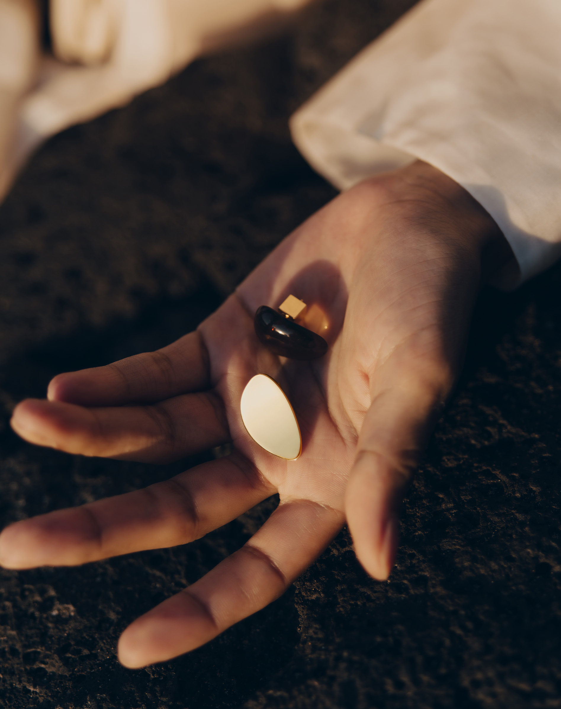 Le travail de formes organiques, la poursuite d’un style à la fois épuré et statutaire forment un lien évident avec la maroquinerie Polène. La ligne de bijoux se donne les mêmes exigences : des designs singuliers et créatifs, des matières nobles et le recours à une confection artisanale.