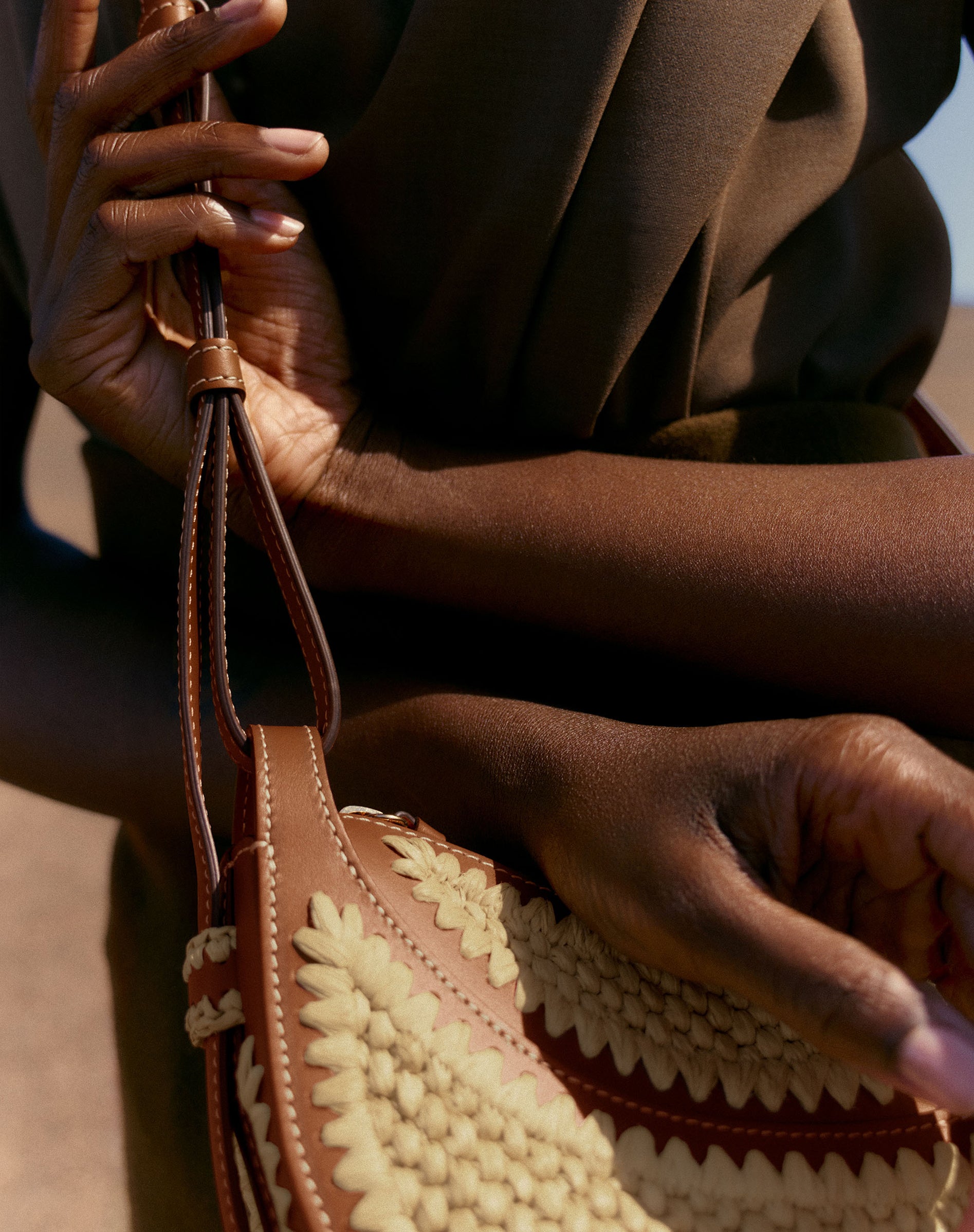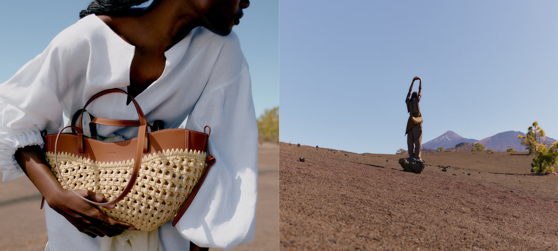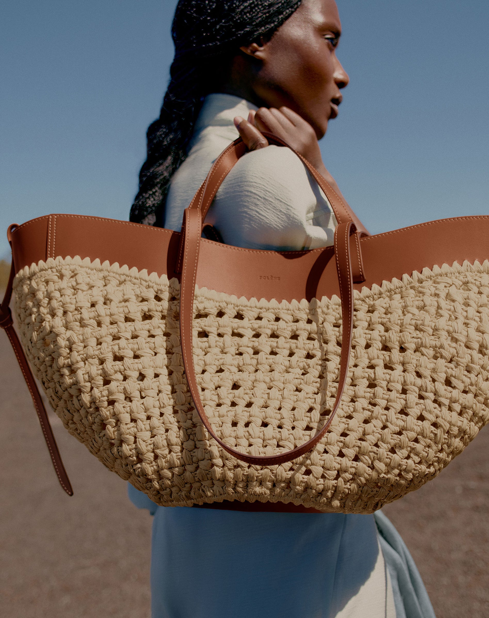 Pour la première fois, trois modèles Polène se parent de cette matière végétale, aussi souple que résistante. Entre le cabas sculpté et le panier, le Cyme et le Cyme Mini s’habillent de raphia grâce à une combinaison inédite de points réalisés au crochet. Pour le Numéro Dix, la technique du point de riz est utilisée pour les demi-lunes également crochetées en raphia. Sur tous les sacs, le cuir et le raphia sont reliés par des points brodés manuellement, symbolisant l’équilibre harmonieux entre ces matières.