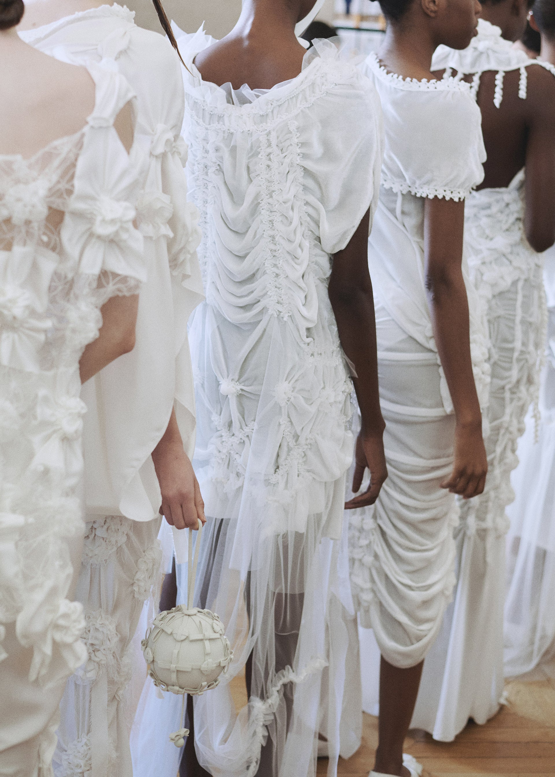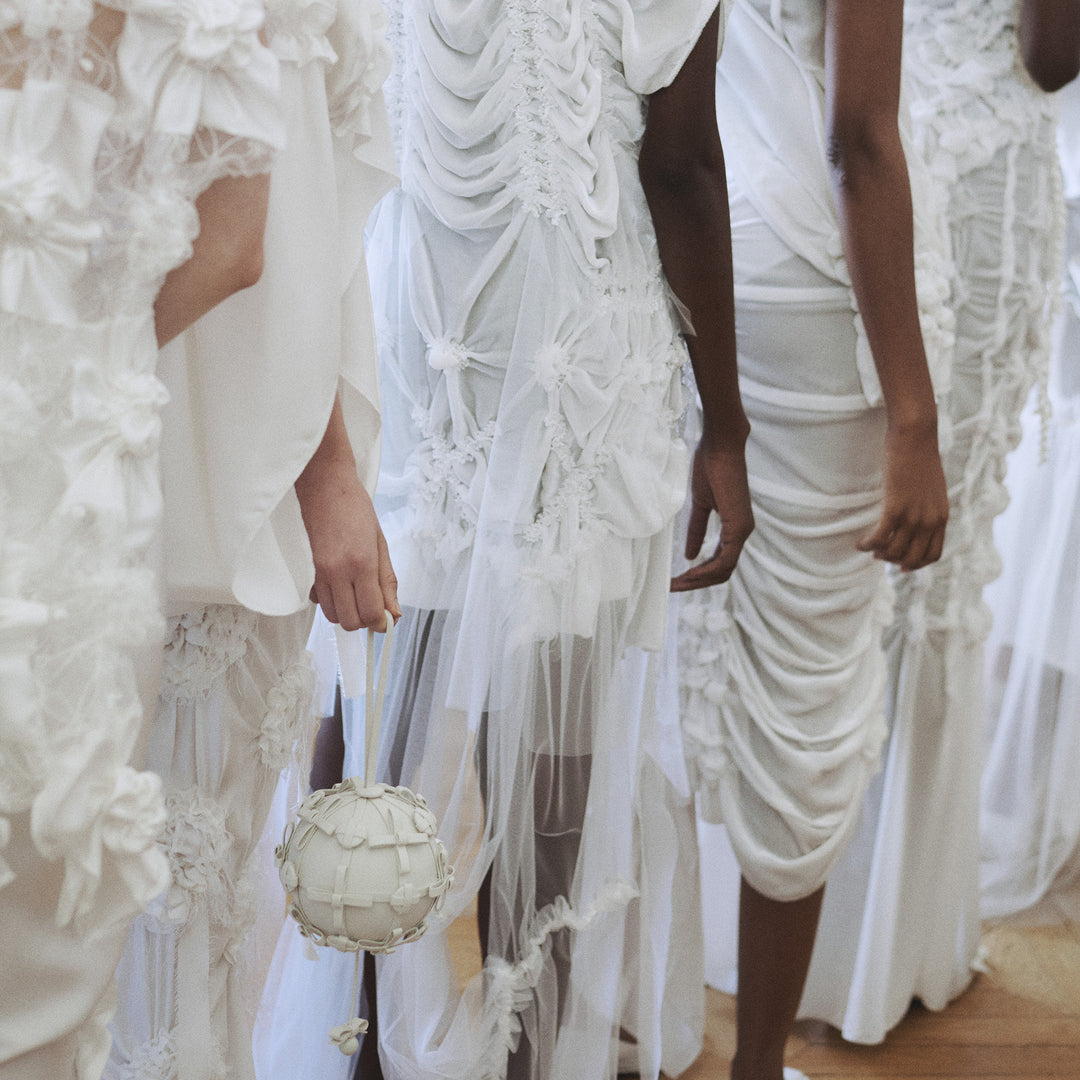 Pensés comme des objets d’arts, les modèles s'habillent d’un délicat maillage de boutons et nœuds, cousu à la main par des artisans expérimentés, rappelant le travail créatif de Róisín Pierce.