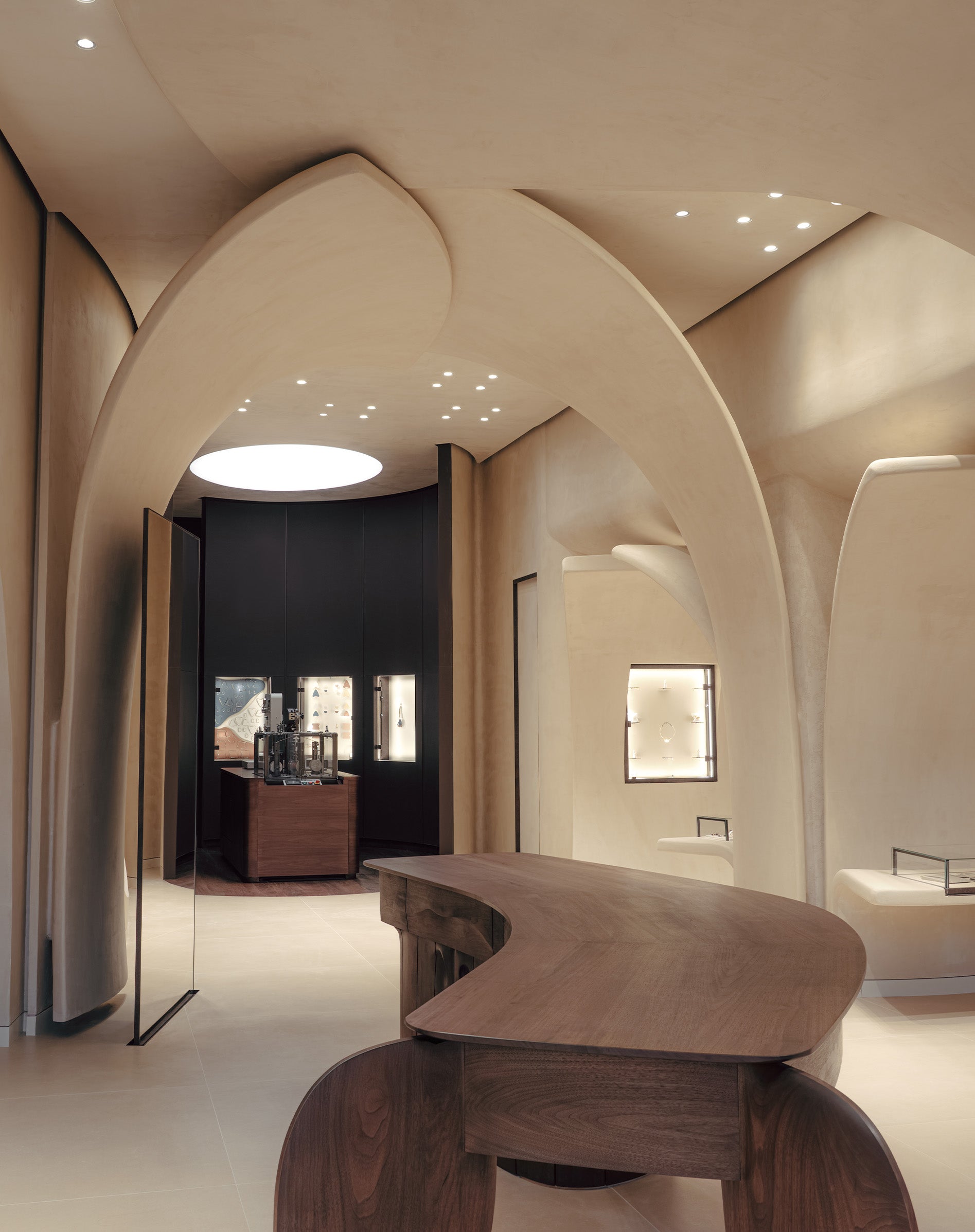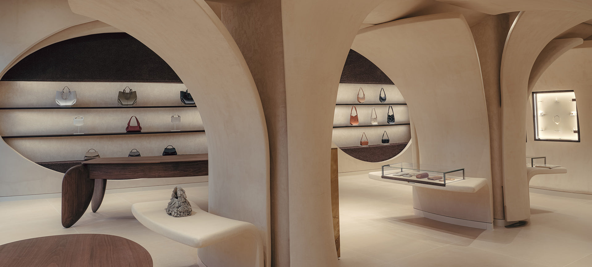 Au cœur d’Indre By, la boutique Polène se déploie comme un cocon dans la ville, où volumes, lumière et matières dialoguent en douceur. L’architecture s’inspire de la fleur d’arum : voûtes et arches s’élèvent comme des pétales, tandis que nuances de beige et de brun rencontrent le cuir, travaillé jusque dans les broderies des étagères selon une technique originale développée par les équipes Polène.