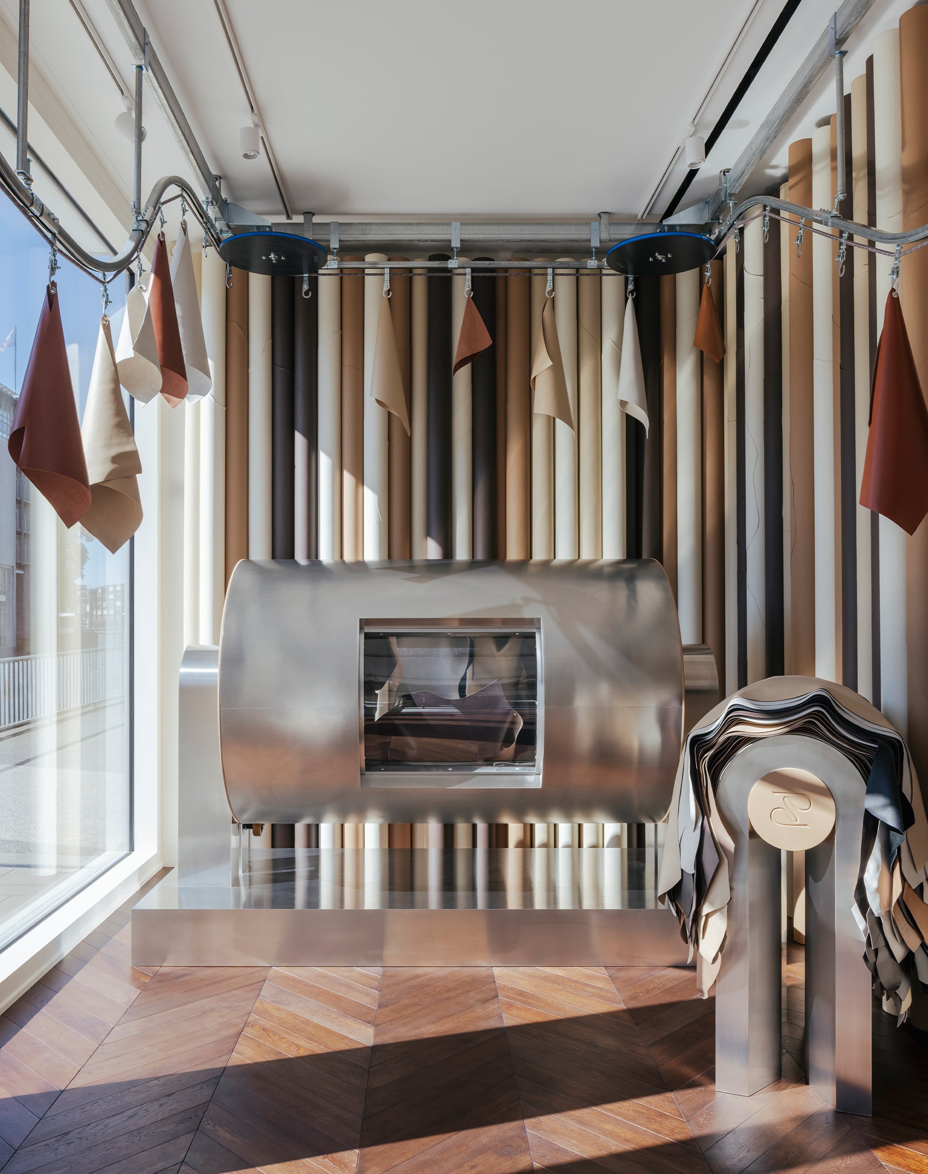 Dominant le canal, Polène imagine l’expérience « L’artisanat à l’œuvre » et met en mouvement une tannerie moderne. Emporté par le rythme du fleuve Elbe, le cuir amorce le voyage de sa transformation, dans un cadre à la croisée entre un atelier d'artisanat et un laboratoire d'expérimentation. Trois machines emblématiques de la maroquinerie, foulon, convoyeur et flexomètre, s’animent et résonnent au cœur de cet espace immersif, comme une pulsation vivante du savoir-faire.