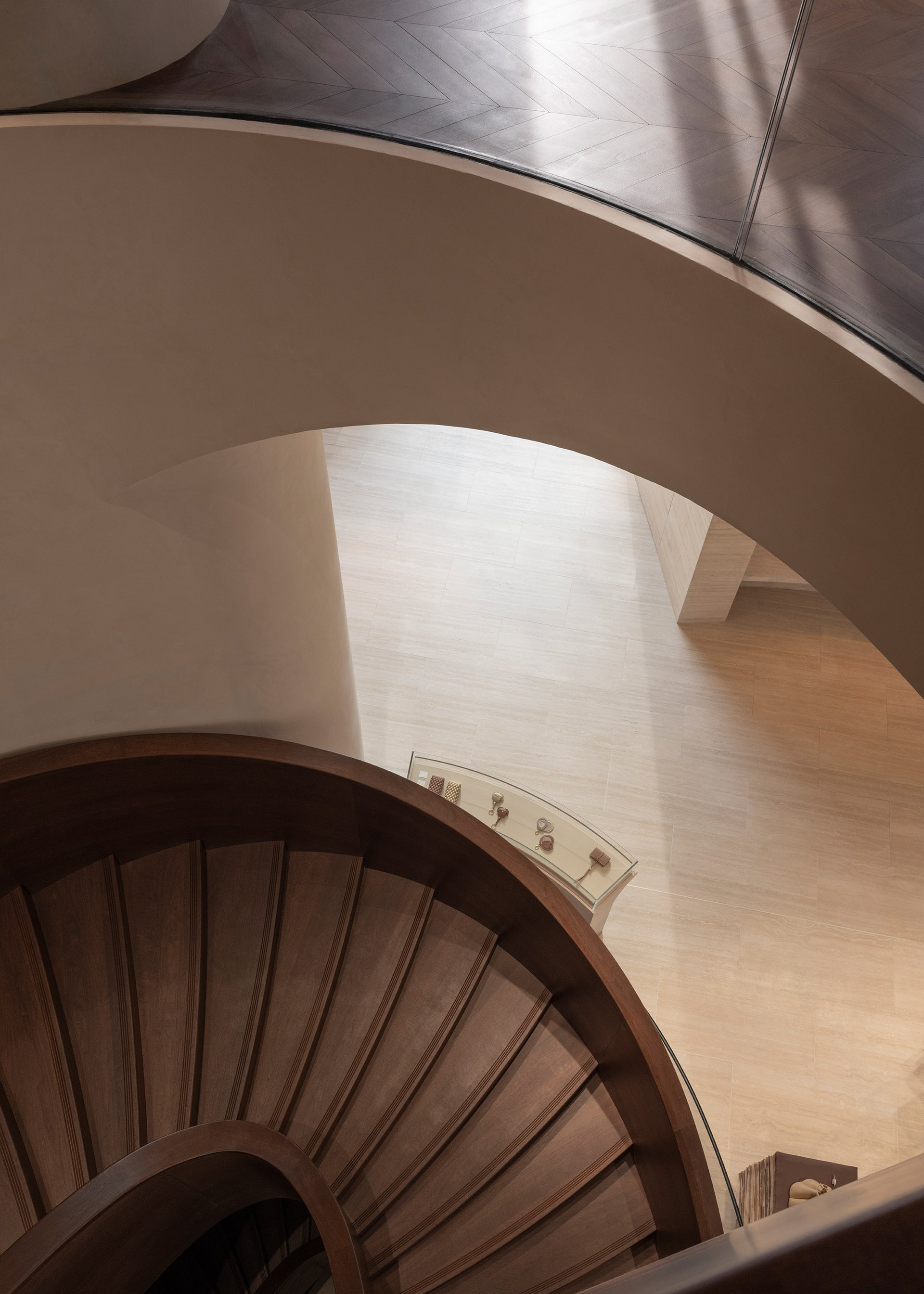 L’escalier hélicoïdal invite à explorer de nouveaux savoir-faire à l’étage supérieur. Un canapé circulaire signé Marianna Ladreyt est composé de cylindres de cuir entrelacés. Afin de mettre en lumière les bijoux, Clémentine Debaere-Lewandowski a imaginé une table composée de 500 pièces en grès blanc réalisées à partir d’empreintes de roche effectuées près des ateliers de confection à Ubrique. Les fragments de territoire figent le caractère éphémère de la nature. Ces partenariats créatifs avec des talents français démontrent l'engagement de Polène en faveur du rayonnement de l'artisanat.