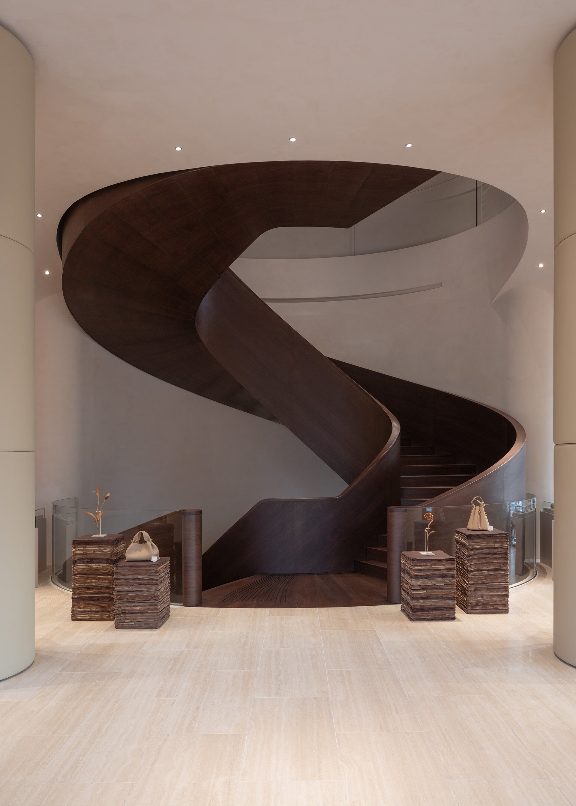Dès l'entrée, la boutique Polène Champs-Élysées se révèle aussi sereine que majestueuse avec ses hautes colonnes. Son espace de 450m2, réparti sur deux étages, a été confié au cabinet d'architecture WGNB. Au rez-de-chaussée, le travail de la courbe se retrouve à travers la construction de dômes jusqu’au mobilier. Les fines étagères en travertin italien, taillées à la main, accueillent les collections de maroquinerie. Sculptées dans un bois de chêne, les tables sont recouvertes d'un plateau en chutes de cuir compressées. Cette valorisation du cuir se poursuit au comptoir de caisse, gainé de LeatherStone® par Elodie Michaud et Rebecca Fezard à la tête de Hors Studio. Le duo de designers et chercheuses a inventé un composant d’un genre nouveau, transformant le cuir en pierre pour obtenir un aspect minéral.