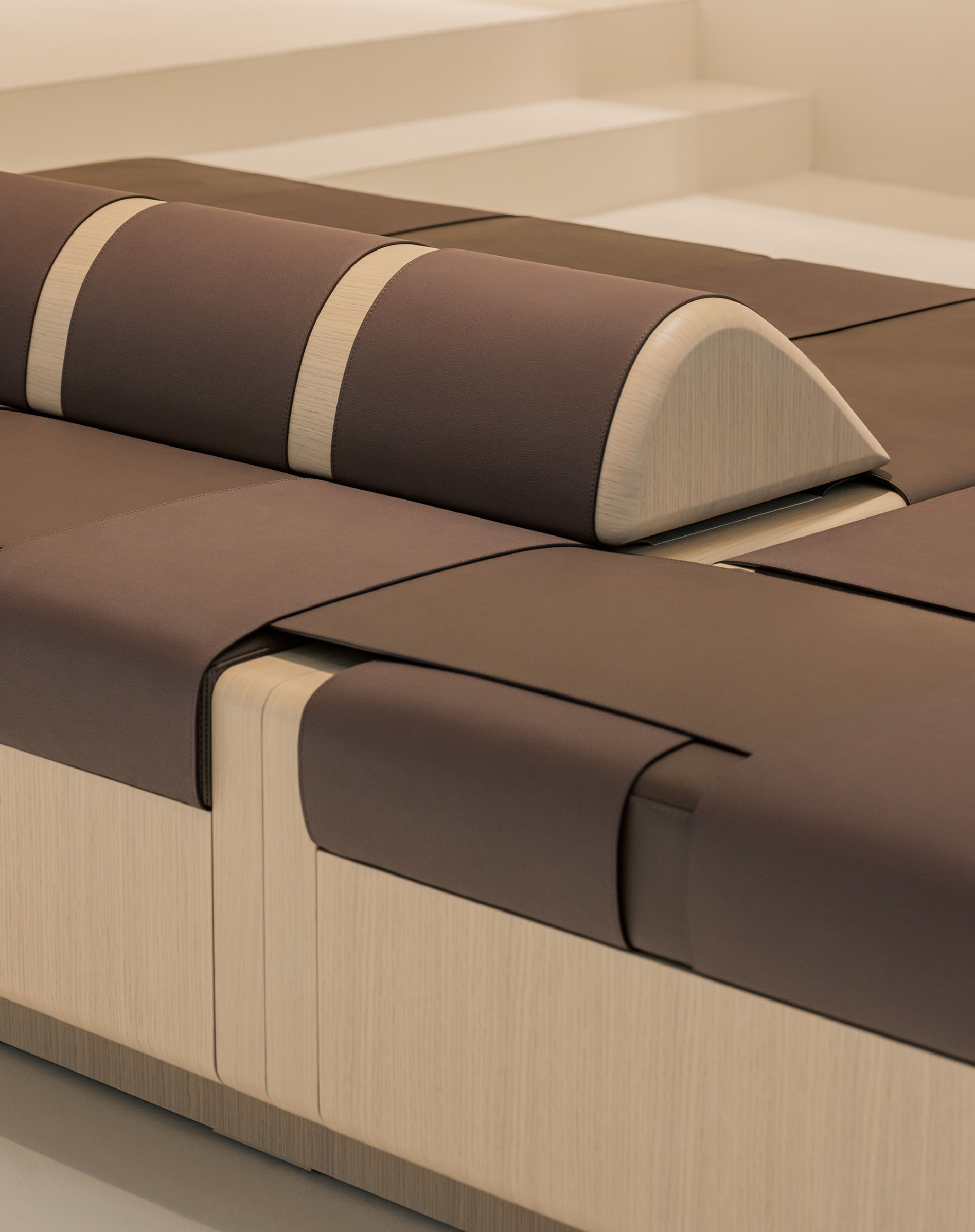 Le cuir est gainé sur les assises et imité dans un trompe l'oeil parfait sur une table en céramique. Celle-ci est le fruit du travail de la céramiste Dasol Lee qui reproduit l'aspect grainé de cette matière chère à Polène au travers d'une technique artisanale perfectionnée au fil des années. Le mobilier en bois de Ginkgo a été sculpté par l'ébéniste Jungjoo Im et témoigne également de l'attachement de Polène à promouvoir les savoir-faire locaux.