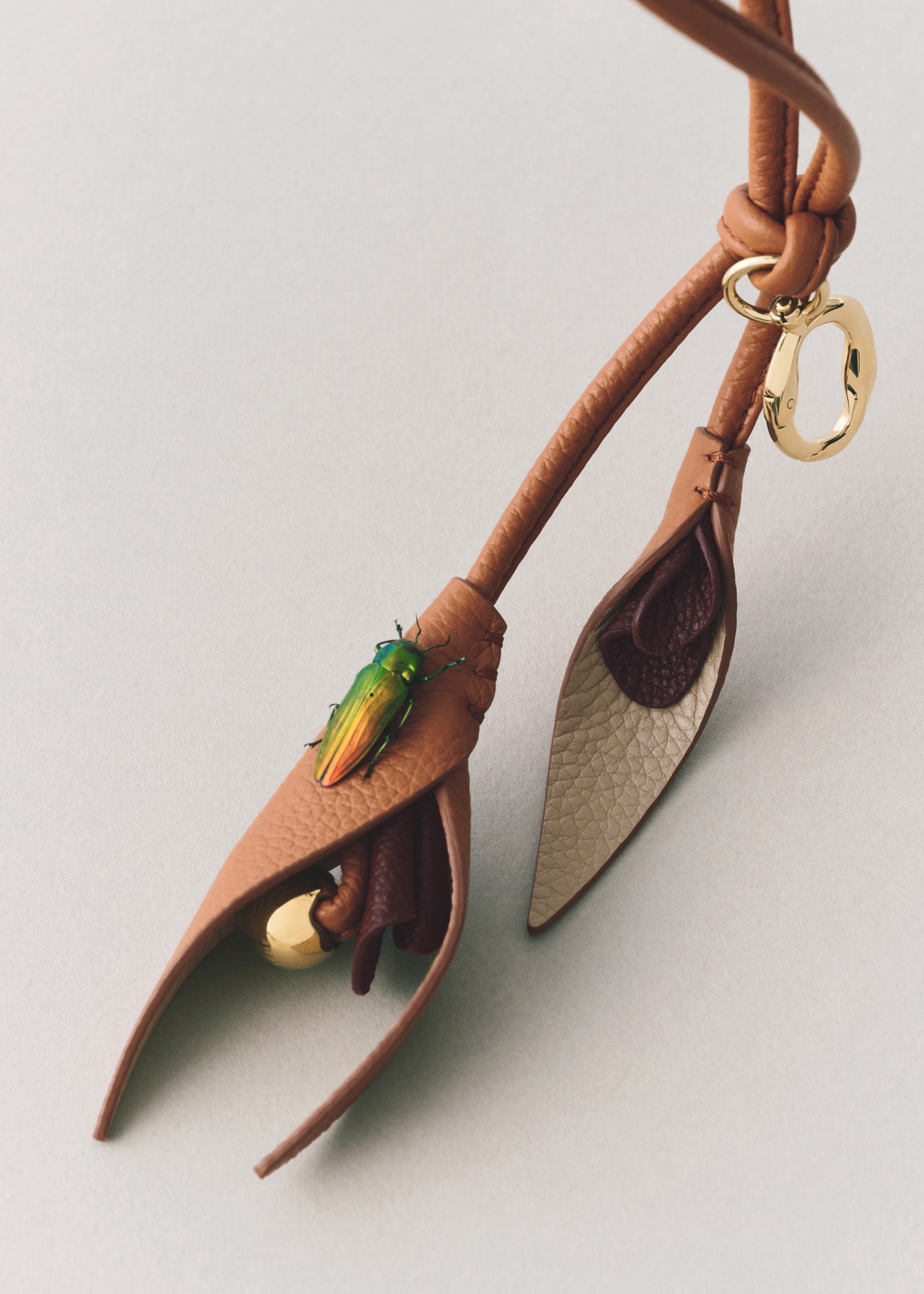 Issu de la collection Plèi 100% réalisée en chutes de cuir upcyclées, le charm « Touka » s'inspire de la fleur Oiseau de paradis. Ses pétales enroulés sont dissimulés sous des feuilles reliées par des points de couture réalisés à la main.Il accessoirise un sac ou s'emploie comme porte-clé.