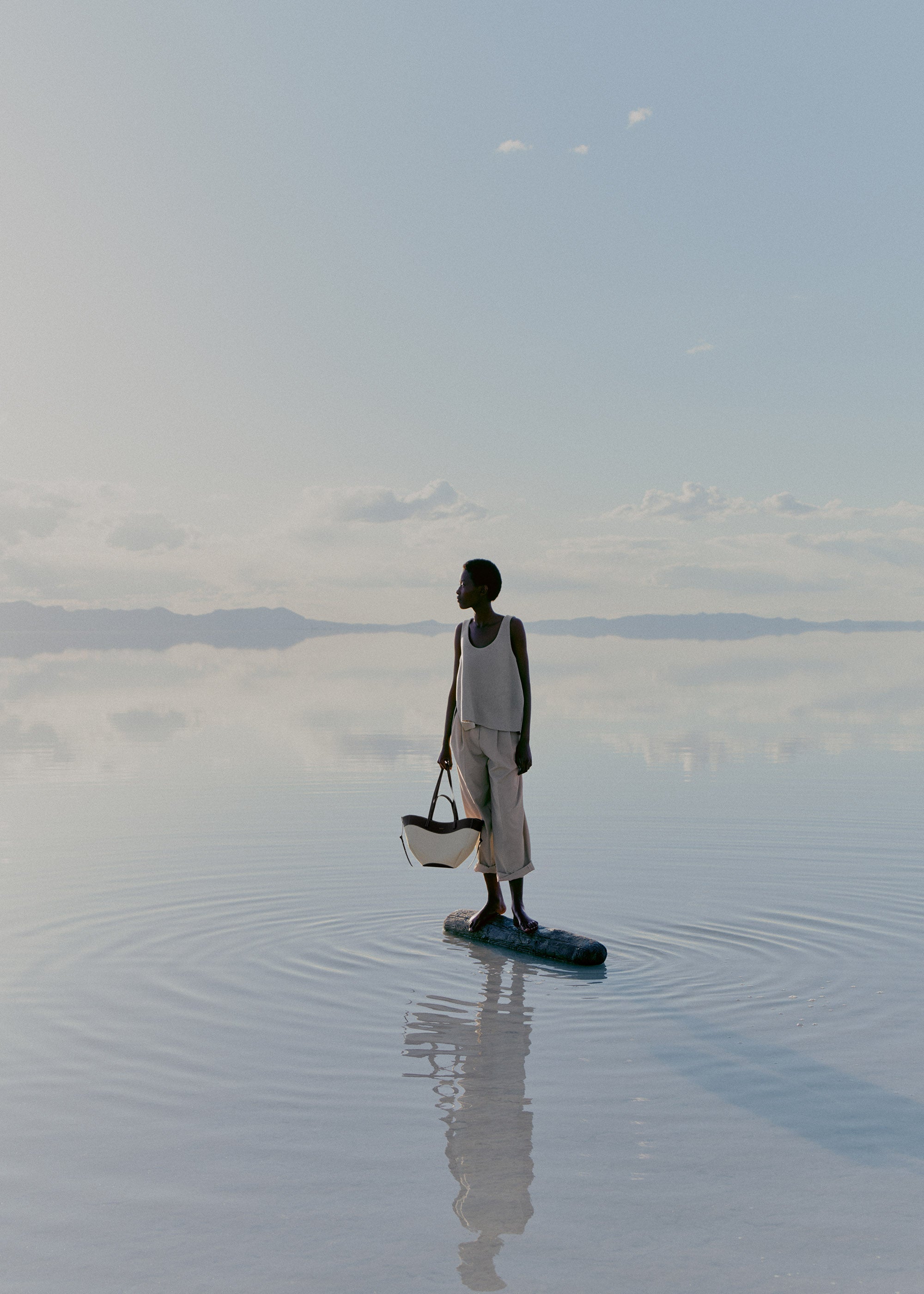 Un cabas sculptural au format compact, fait d'ondulations, de plis et d'arrondis. Ses lanières sont nouées à la main et en soulignent la forme signature. L’édition tissée en propose une réinterprétation estivale, renforcée par un fond en cuir.