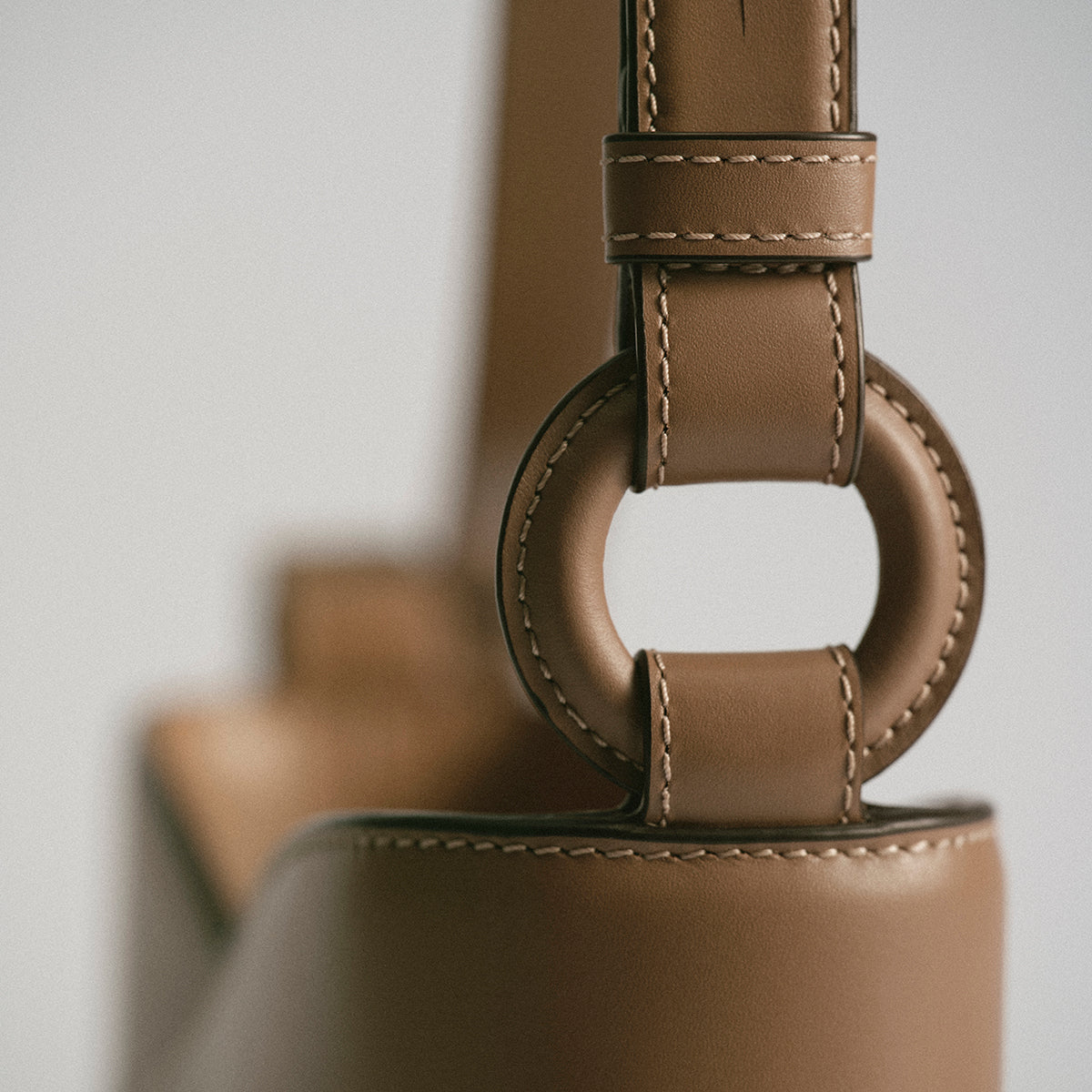 Composé de deux modules de cuir identiques qui s'entrecroisent, le modèle "Nodde" est un sac aux lignes entrelacées, soulignées par des coutures minutieuses, formant une symétrie parfaite.