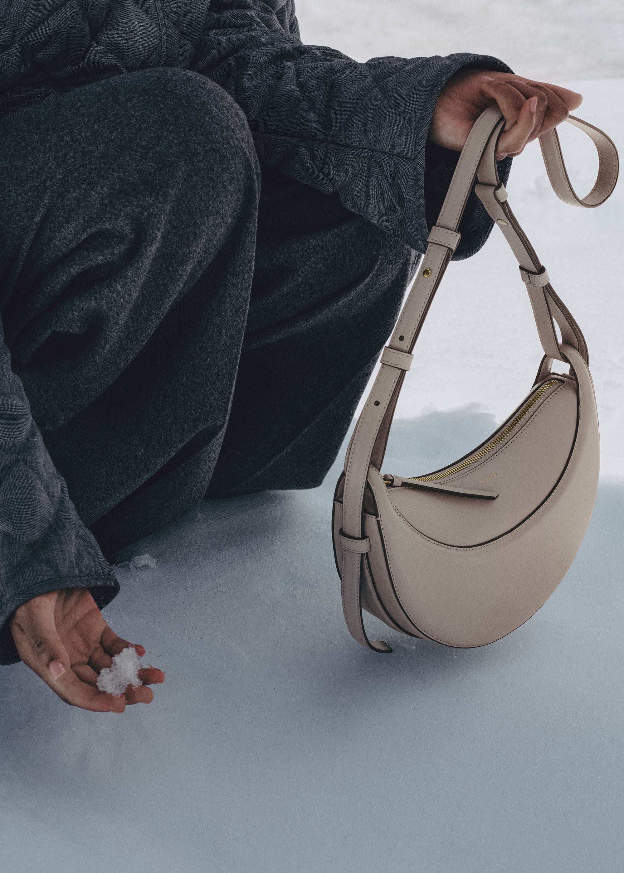 Avec sa forme bombée, son garnissage avec mousse et ses points cousus à la main, le "Numéro Dix" s’inspire des codes équestres de la sellerie. Son design demi-lune joue sur la juxtaposition de courbes.