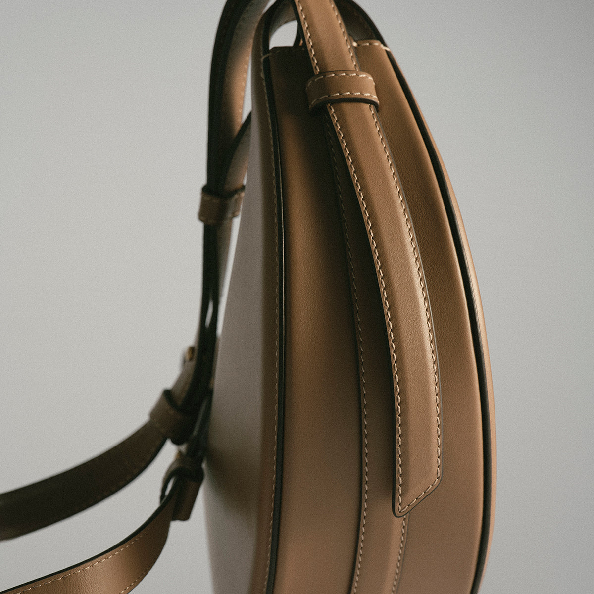 Avec sa forme bombée, son garnissage avec mousse et ses points cousus à la main, le "Numéro Dix" s’inspire des codes équestres de la sellerie. Son design demi-lune joue sur la juxtaposition de courbes.