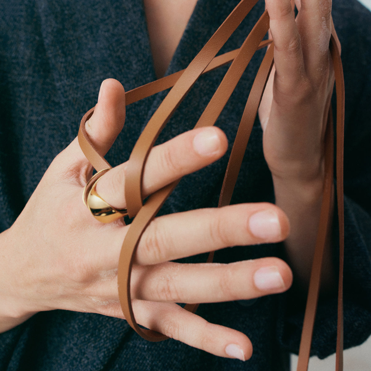 Laiton doré à l’or 24 carats Cuir de veau pleine fleur lisse italien De confection artisanale, les bijoux Polène requièrent une attention particulière pour en préserver la qualité. Éviter le contact avec l'eau, la mer, les produits cosmétiques ou chimiques, le gel hydroalcoolique, les sources de lumière et de chaleur. Pour minimiser les rayures et limiter l'oxydation, ne pas porter le bijou lors d'activités physiques ou manuelles. Ne pas ajuster la forme des bijoux rigides. Lorsque non porté, le ranger seul, dans un espace ouvert, à l'abri de l'humidité. Se nettoie à l’aide d’un chiffon doux.