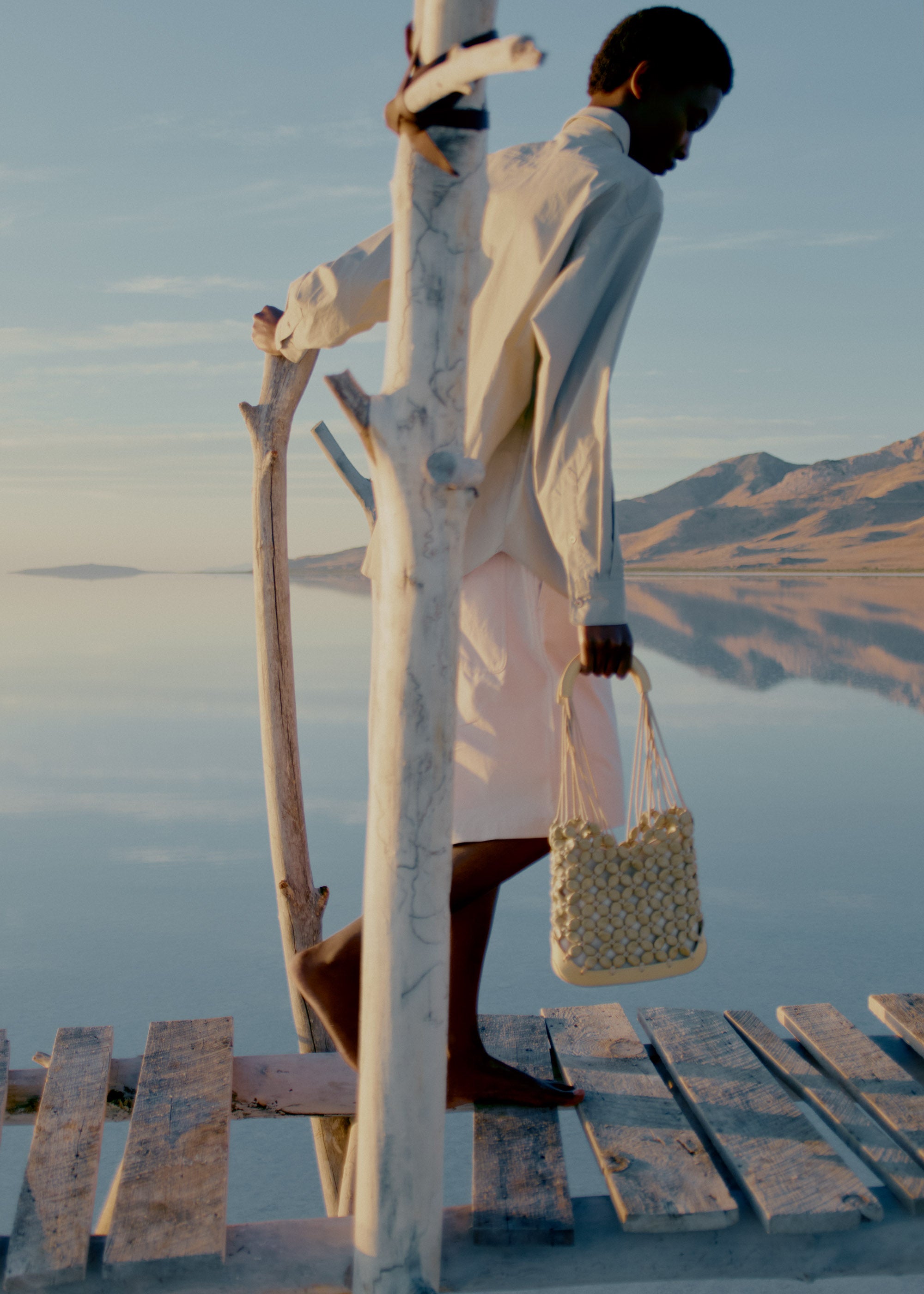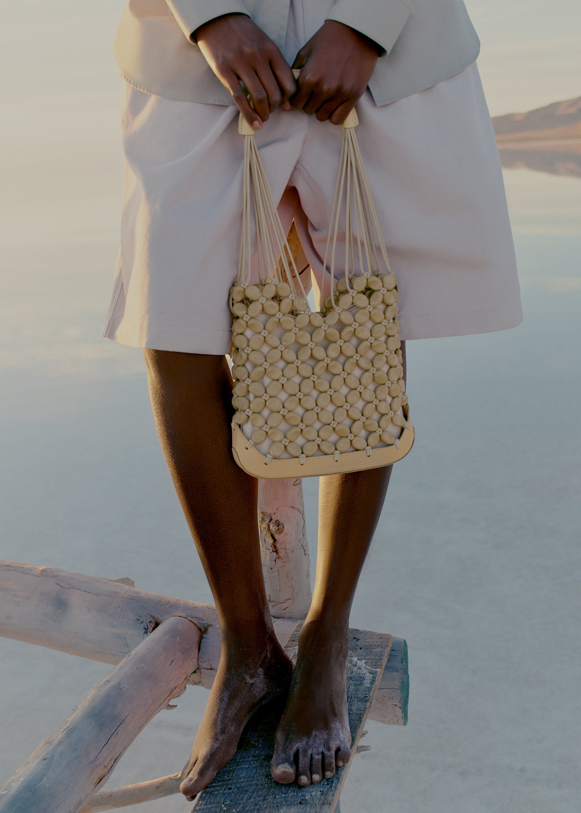 Issu de la collection Plèi qui met au centre du jeu l’upcycling des chutes de cuir, le modèle « Solé » mêle innovation et artisanat. Fabriquées en France, les 240 perles, au design inspiré des galets, sont moulées à partir de chutes de cuir issues des collections Polène. Enfilées sur des cordons de coton ciré, elles sont retenues par 120 nœuds faits à la main selon la technique artisanale du macramé. Ce sac, d’inspiration filet, est réhaussé de détails maroquiniers avec son fond et sa poignée en cuir lisse surpiqué.